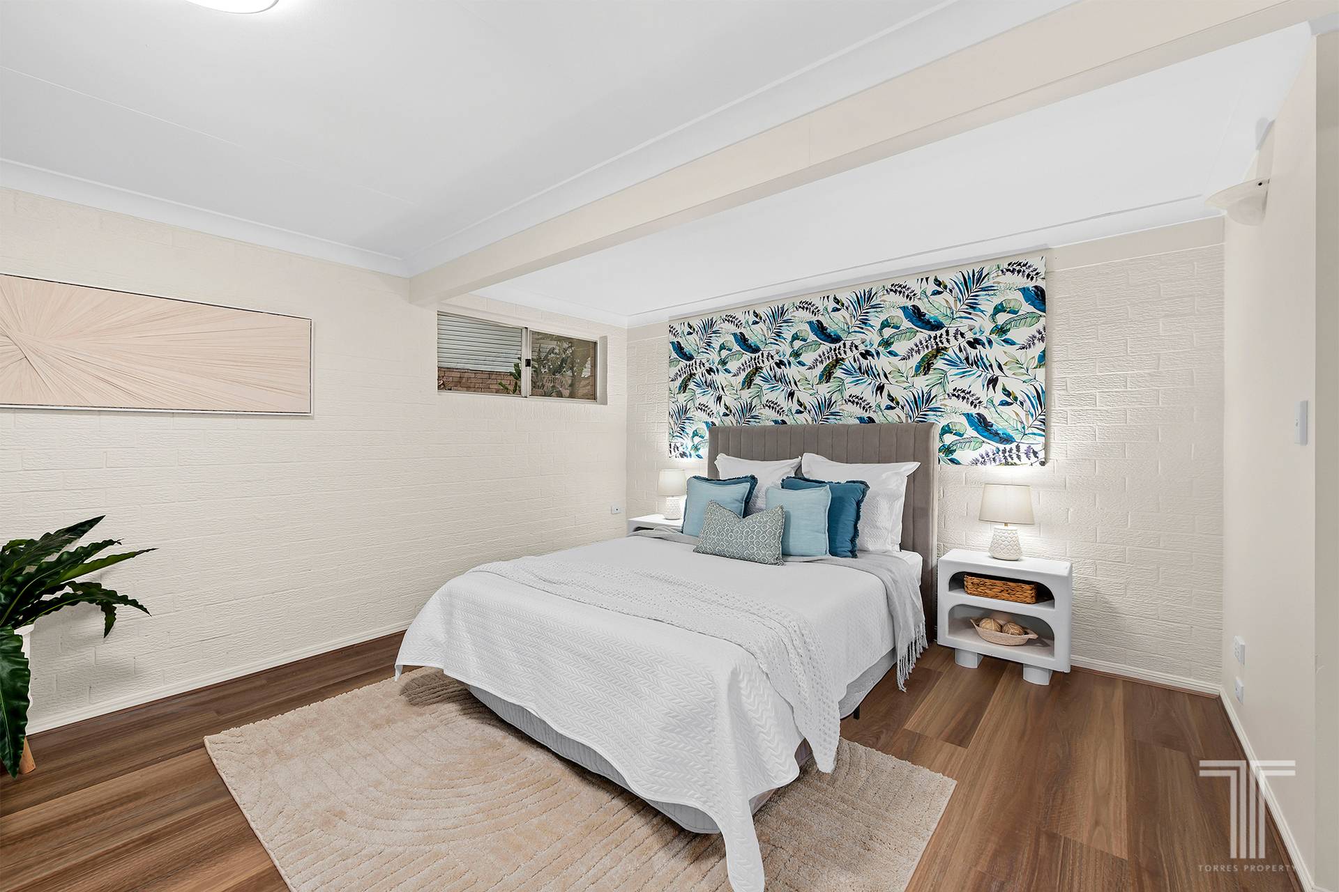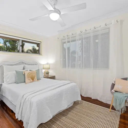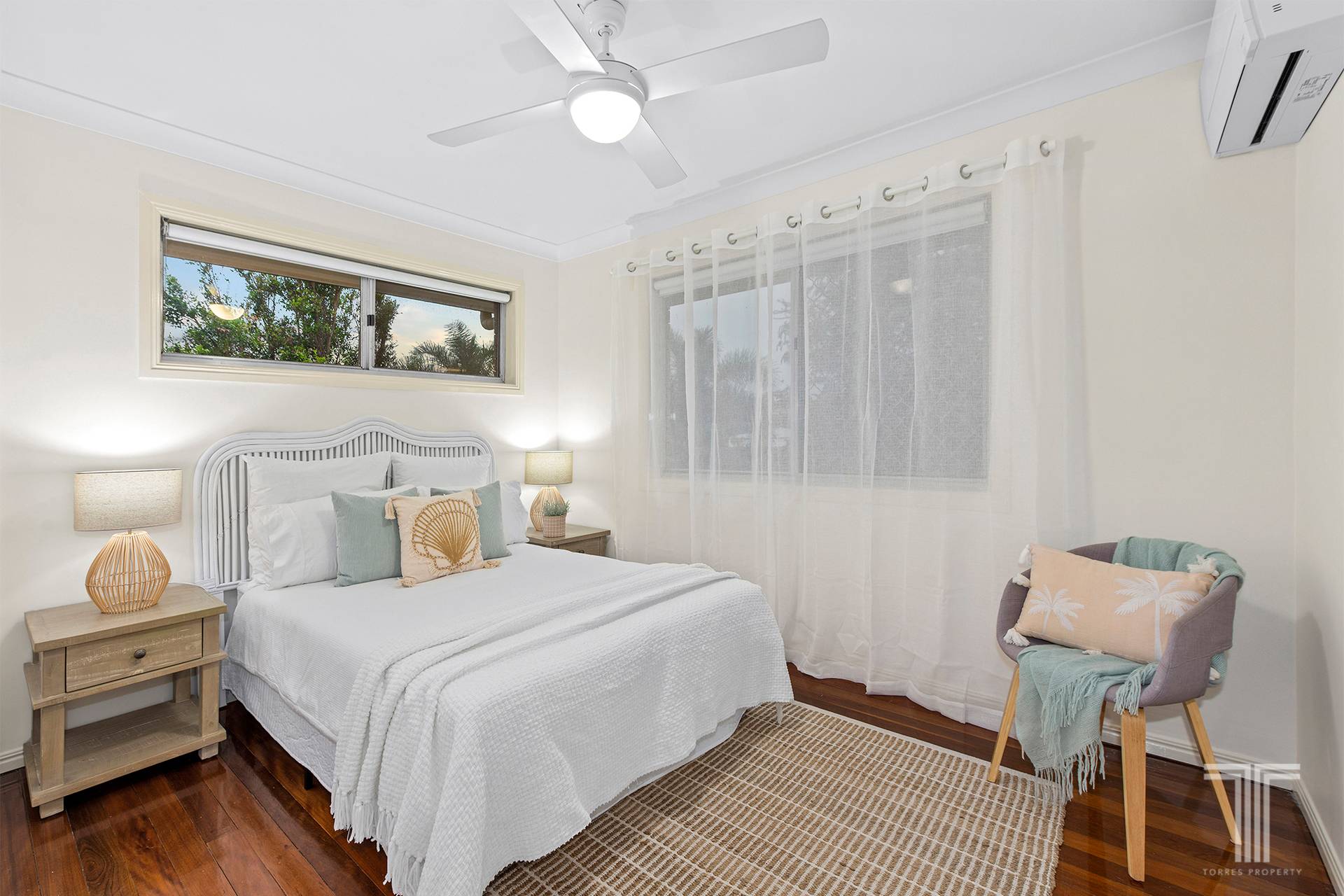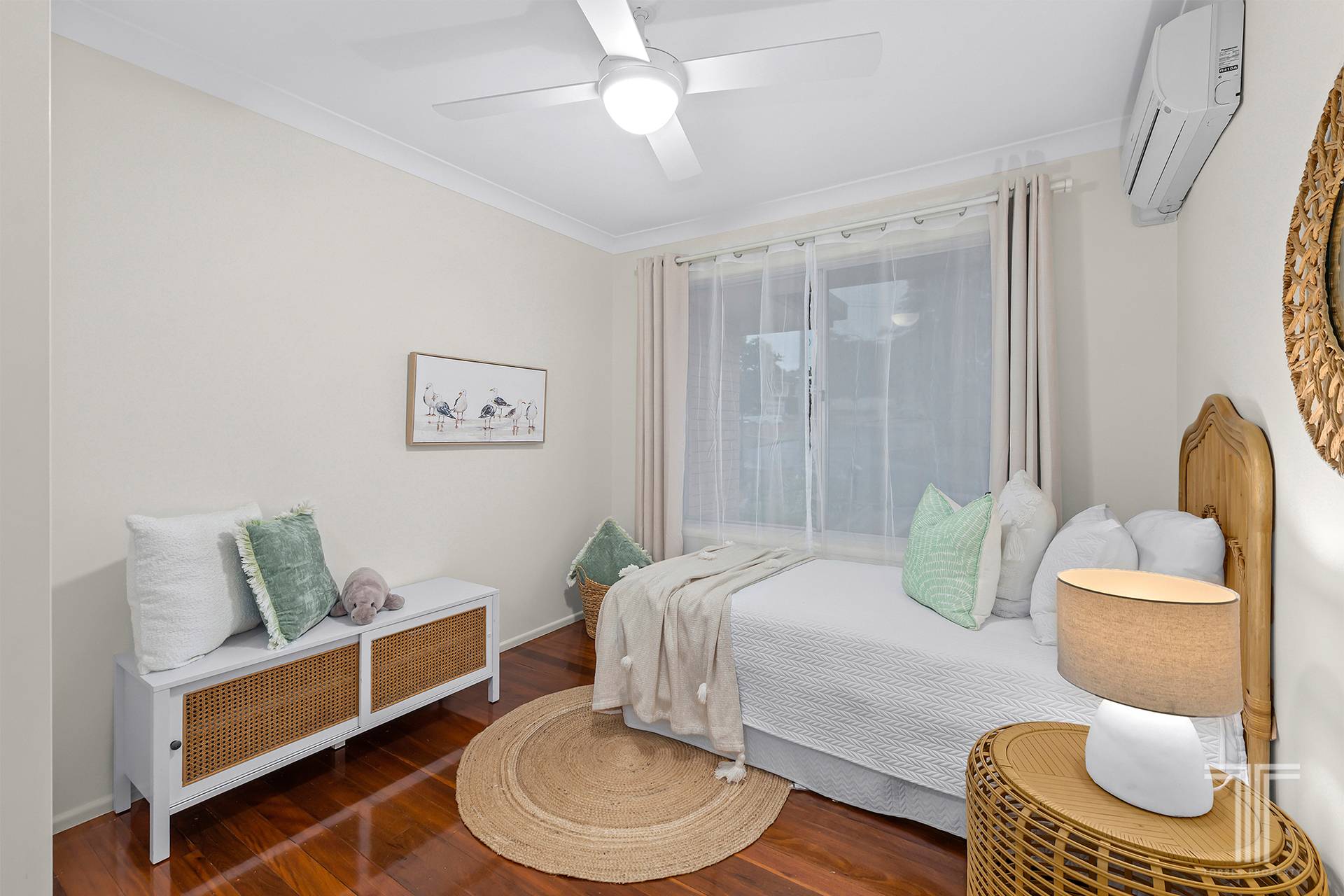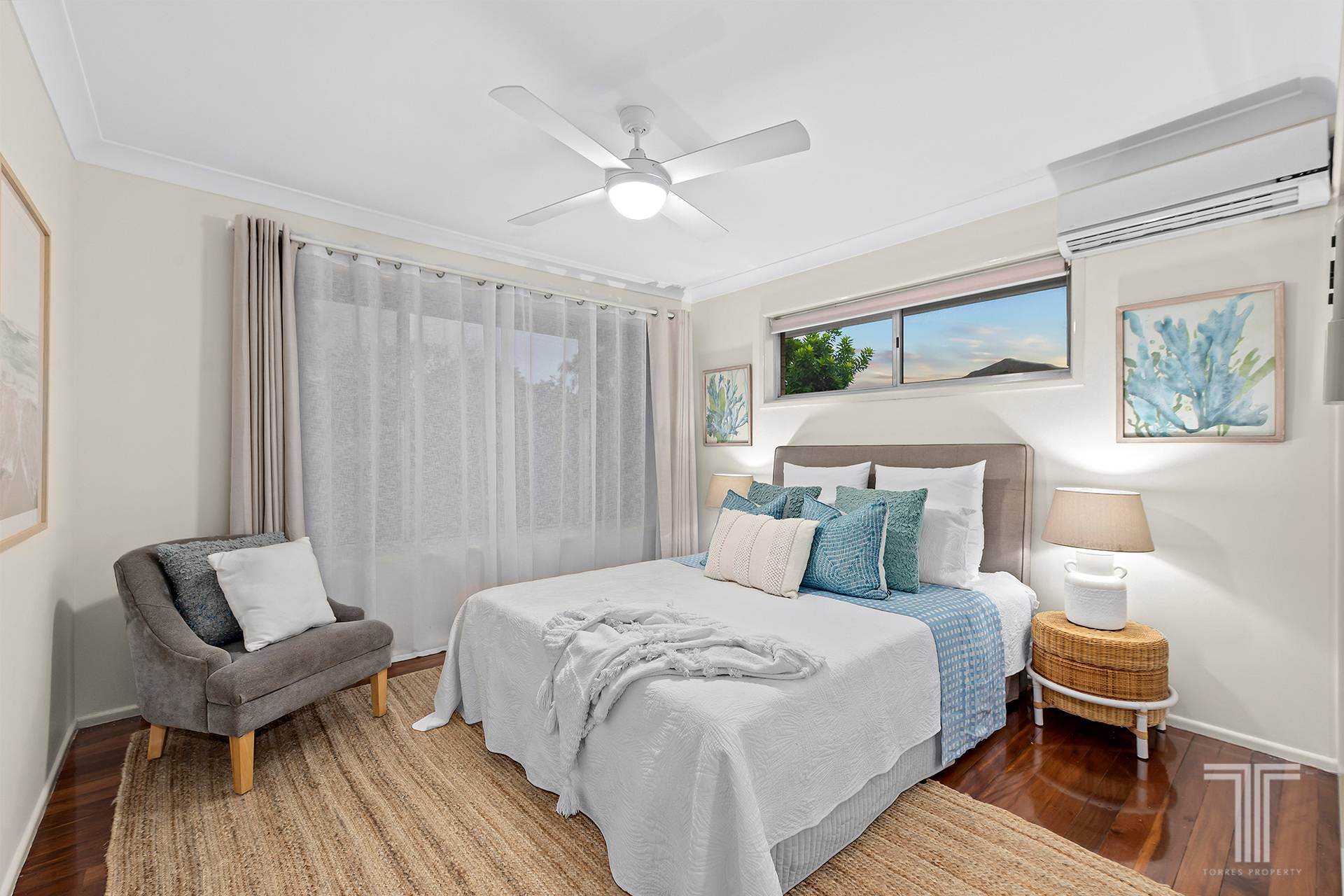 The upper level is dedicated to family accommodation, featuring well-sized bedrooms, all fitted with built-in wardrobes, ceiling fans and air conditioning, and serviced by a central bathroom. Designed for everyday comfort, the home provides excellent separation between living and bedroom zones, while air conditioning to the main living area ensures comfort all year round.