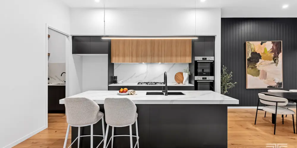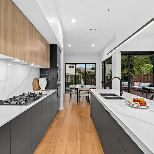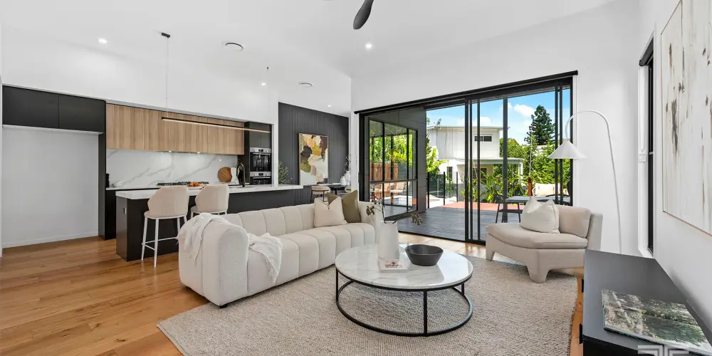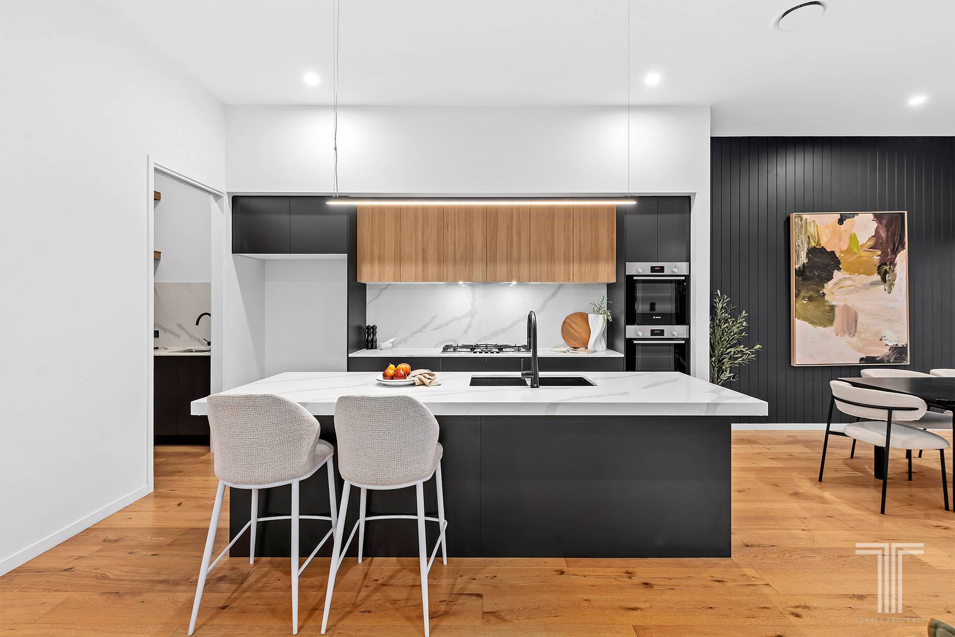 The ground level has been designed for relaxed everyday living and effortless entertaining, centred around a spacious open plan kitchen, dining and living area that flows seamlessly from the entry through to the rear of the home. Also on the lower level is a well-positioned guest bedroom and full bathroom, making it ideal for visitors, extended family or multi-generational living. A separate laundry with direct outdoor access adds further practicality. Zoned ducted air conditioning ensures comfort in every season, while the intelligent layout allows spaces to feel both connected and privately defined.
