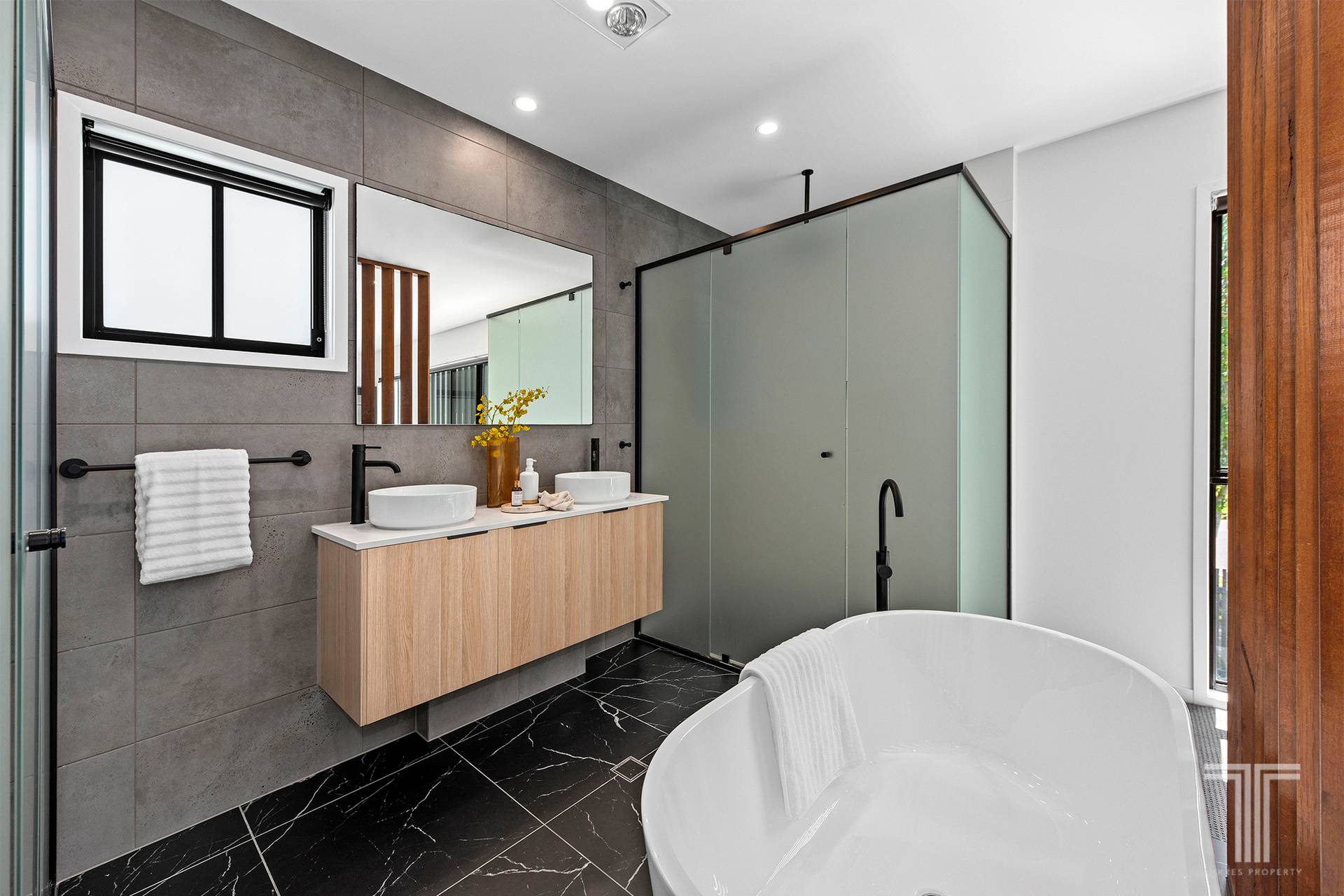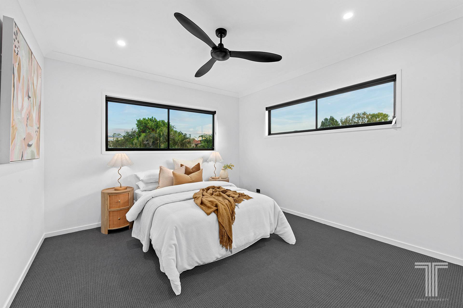 Upstairs, the home continues to impress with its intelligent design and peaceful outlook. A stylish Jack and Jill bathroom complete with a bathtub and a separate toilet/powder room services this floor, creating a practical and family friendly layout. Ceiling fans throughout the bedrooms, paired with zoned ducted air conditioning, ensure year-round comfort, while leafy green views across Whites Hill, bring a calming natural backdrop into the home.