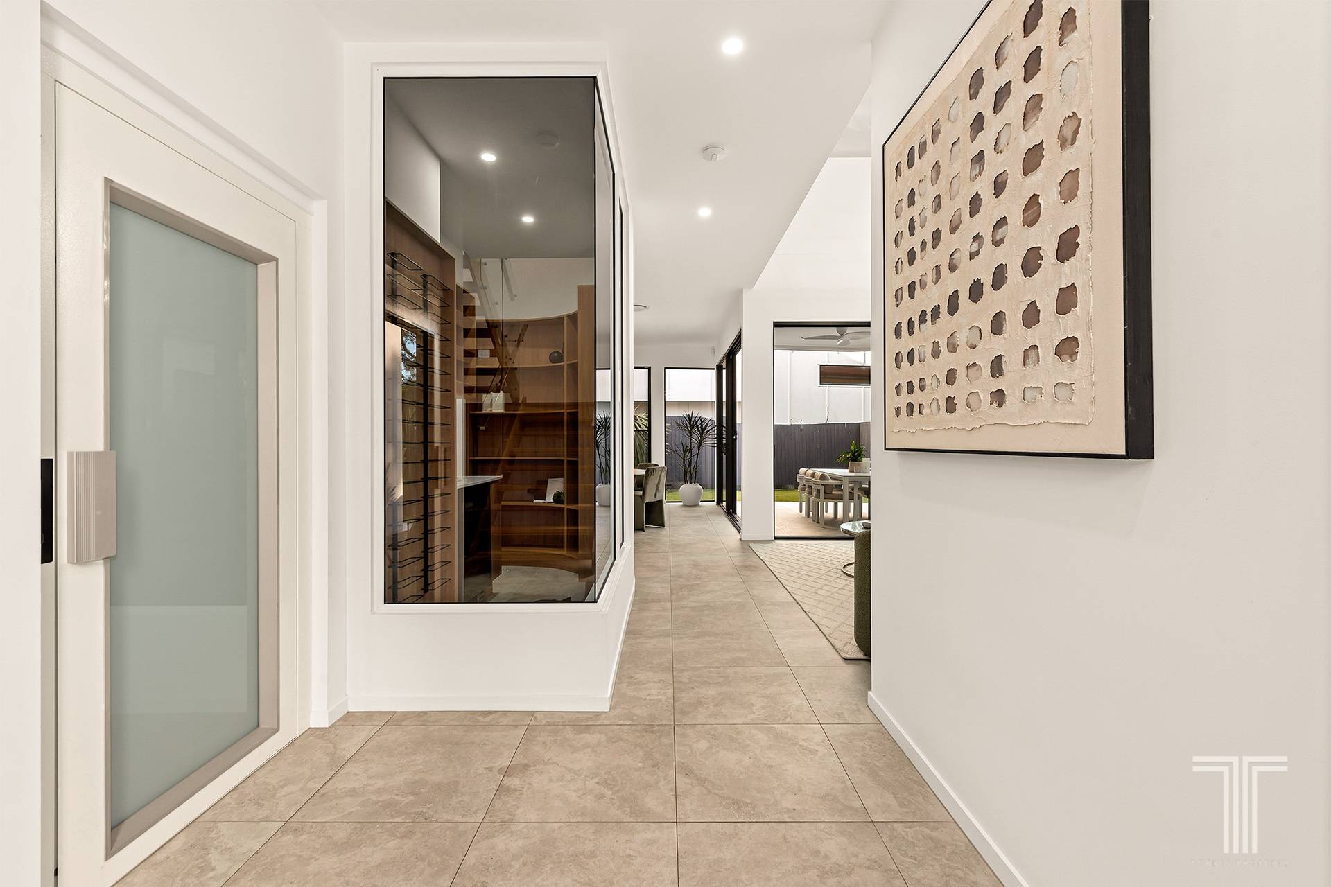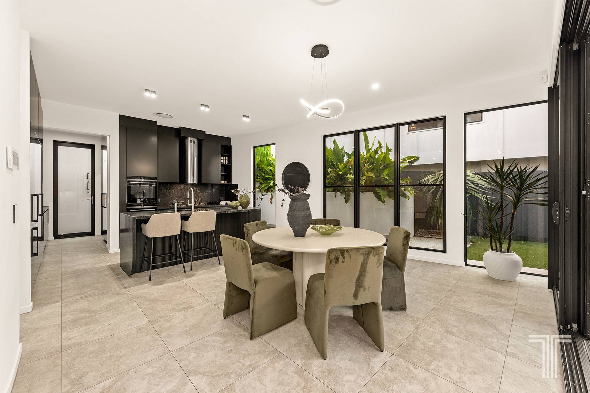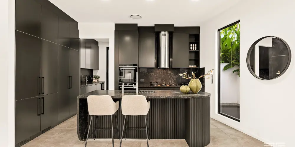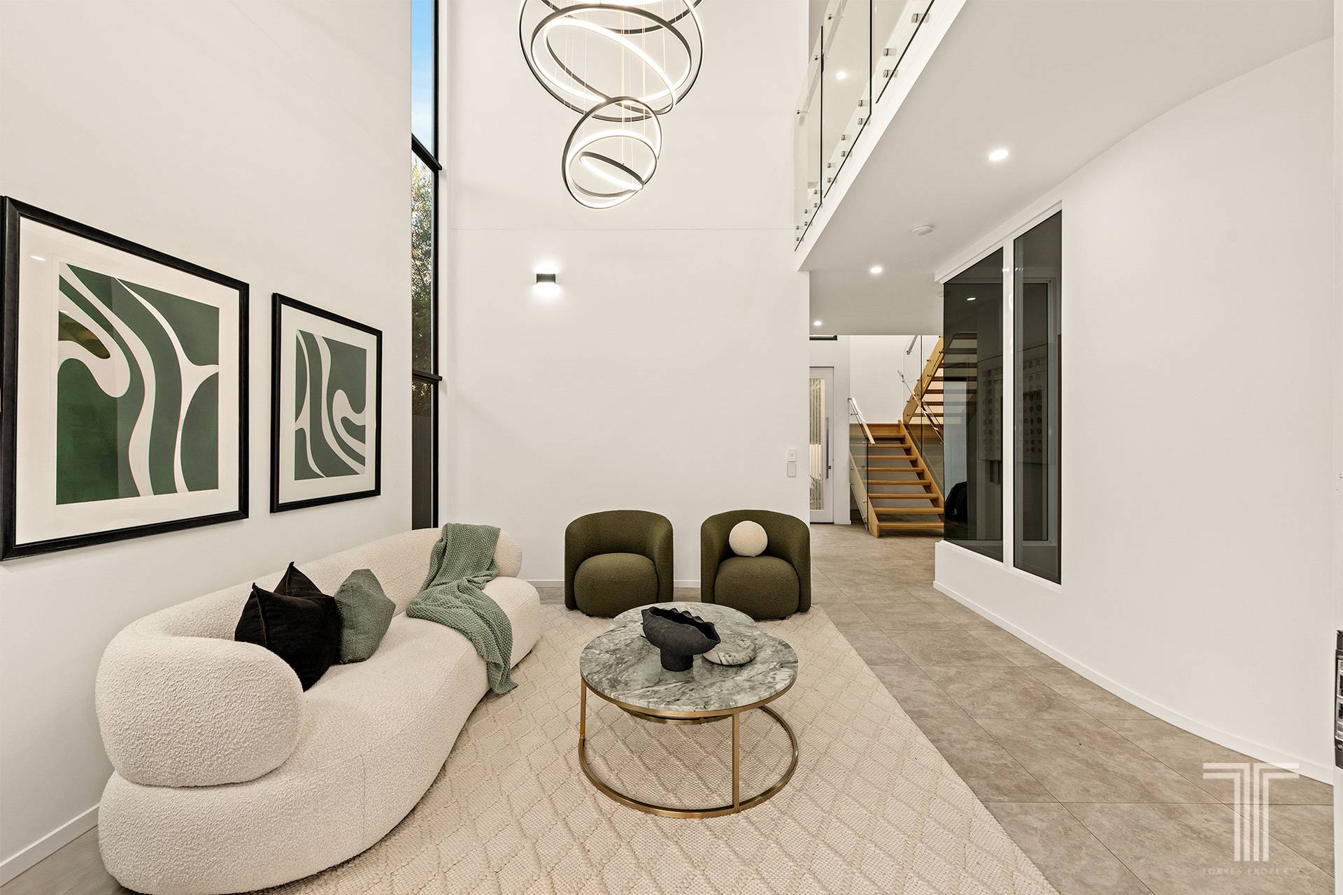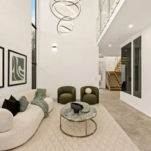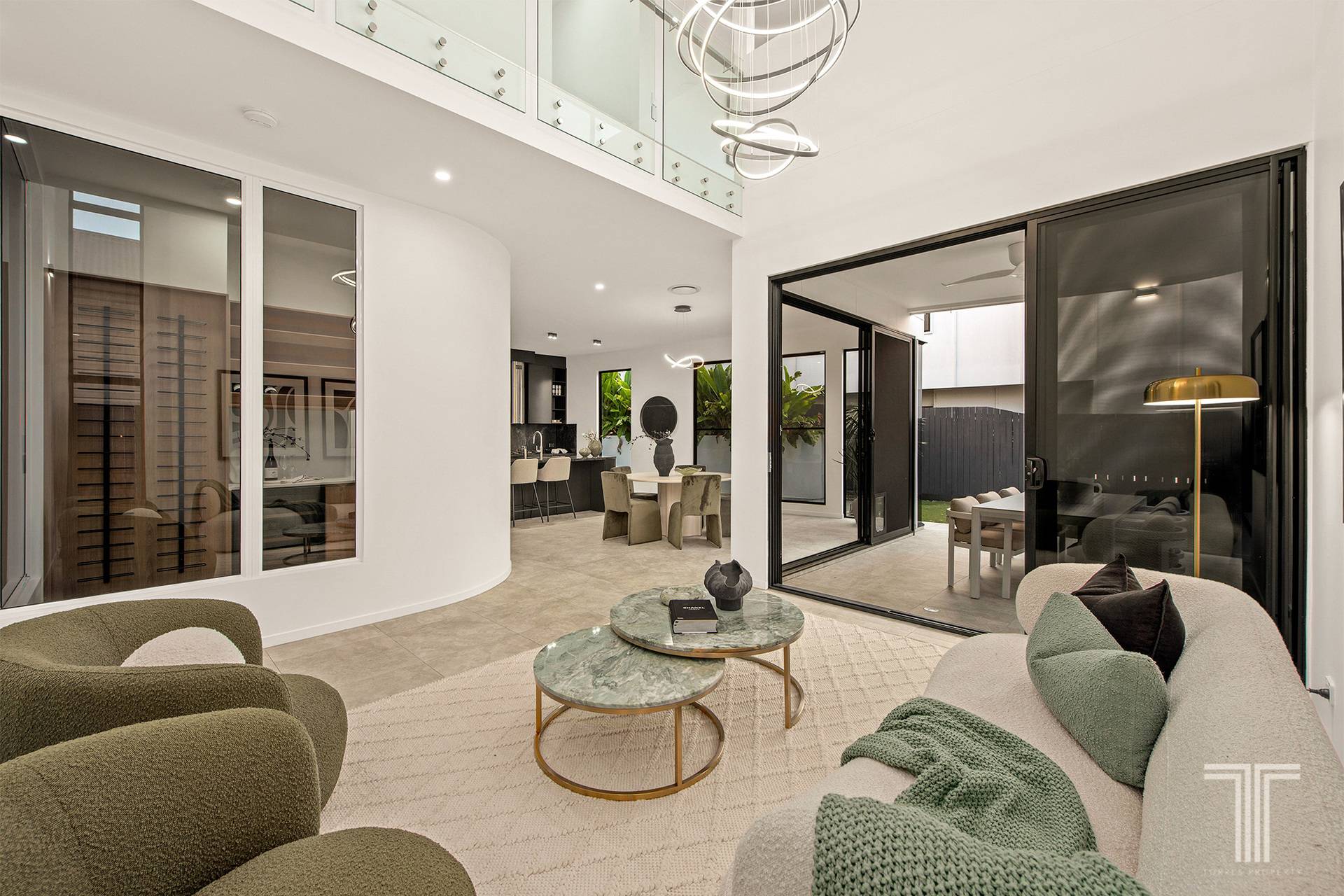 Step through the front door and the sense of scale is immediate. A sweeping entry draws you inward, where sculptural curves guide the eye through the home, from rounded walls to cylindrical details that repeat with intention. Even the statement lighting suspended within the living void echoes the circular theme, creating cohesion, rhythm and a feeling of considered luxury at every turn.