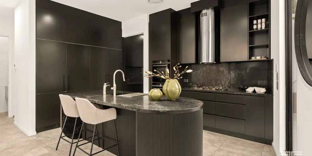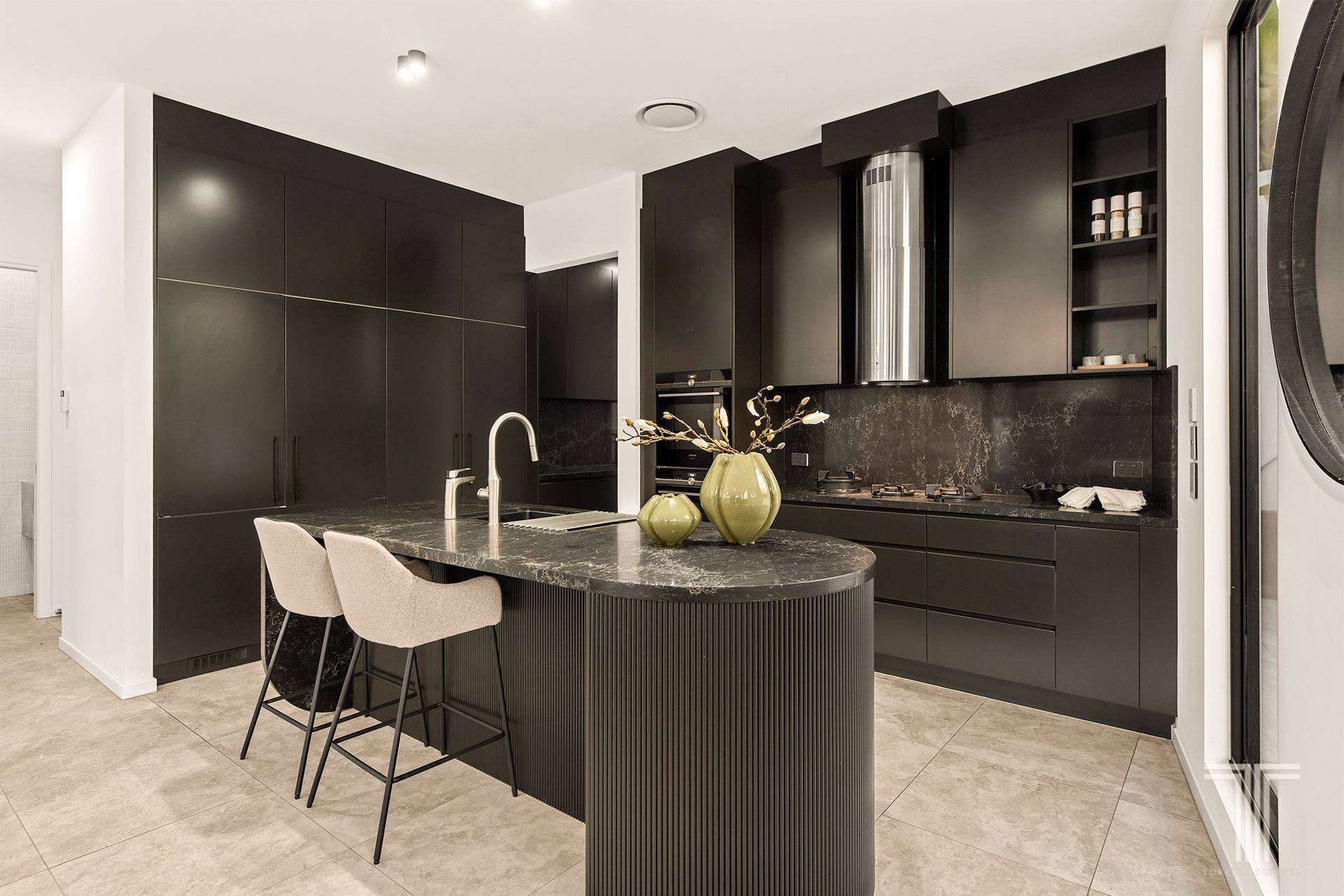 The ground level is designed for living and entertaining on a grand scale. The open-plan living and dining zones are generous yet warm, anchored by a kitchen that embraces a deeply considered palette, while remaining timeless and neutral. Here, form meets function, with curved island ends, a cylindrical exhaust feature and a seamless connection to the butler's pantry and cellar. Large sliding doors dissolve the boundary between inside and out, opening to an expansive alfresco complete with outdoor kitchen, level lawn and a striking in-ground pool. By day or night, the pool becomes a visual centrepiece, with colour-changing lighting visible from the main living spaces, adding atmosphere and drama.