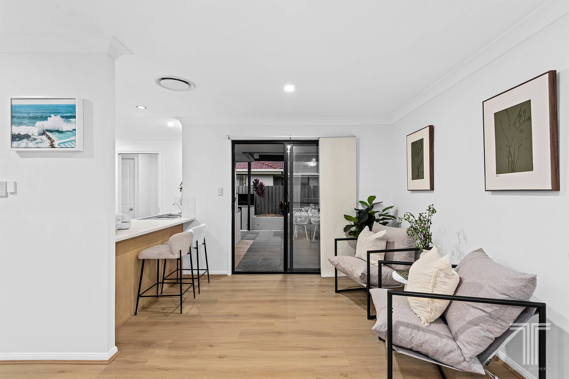 Multiple living spaces flow seamlessly to the outdoor entertaining zone, where an outdoor kitchen and bar make hosting family and friends a breeze all while remaining easy-care and low maintenance.