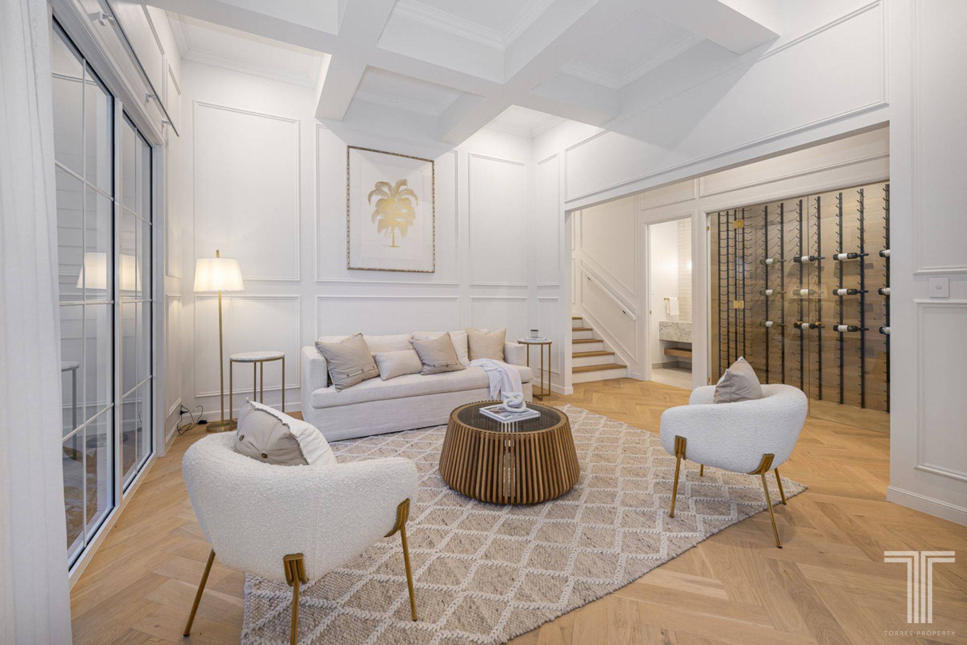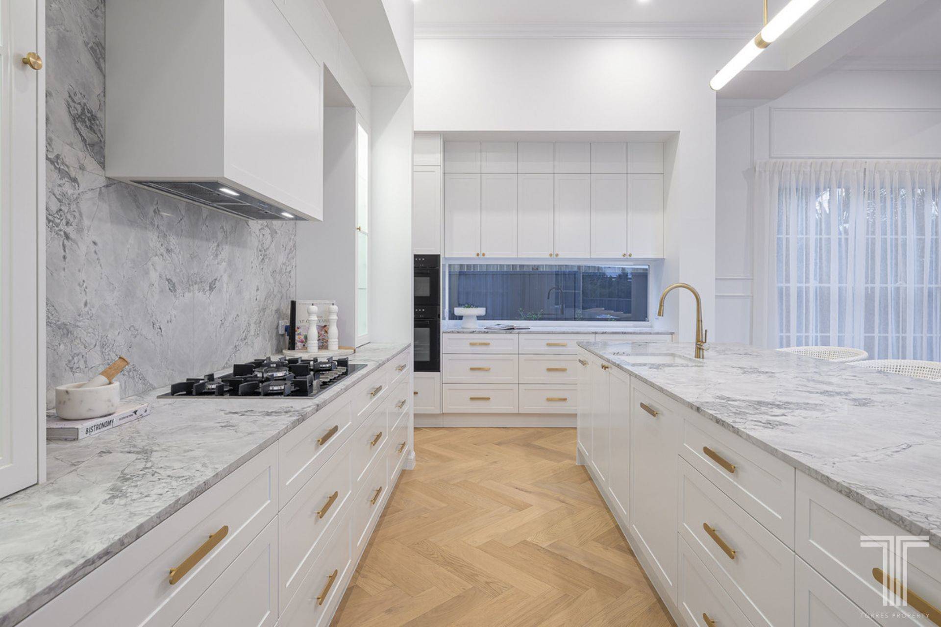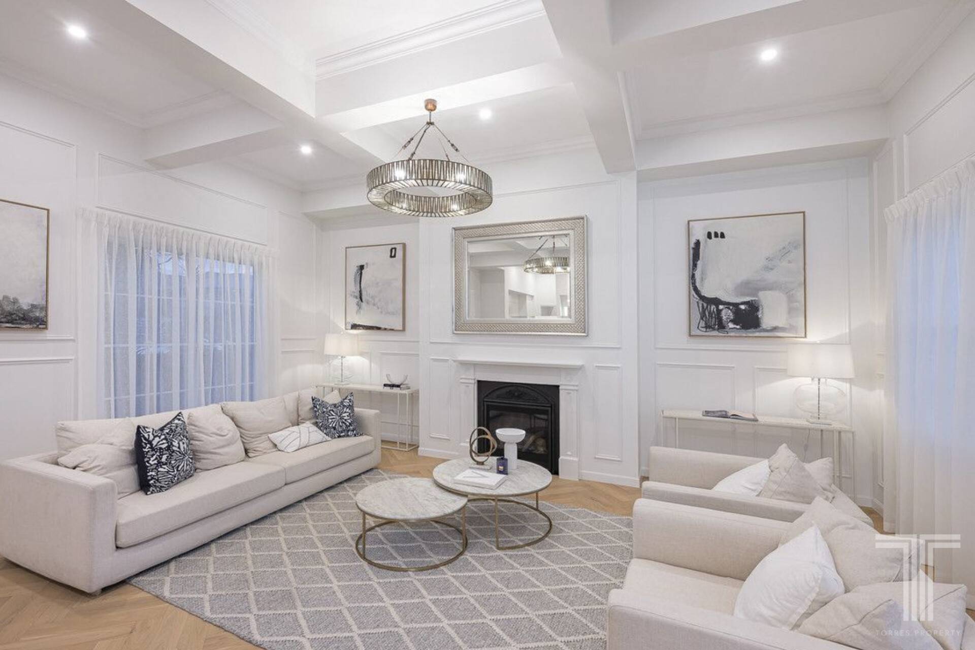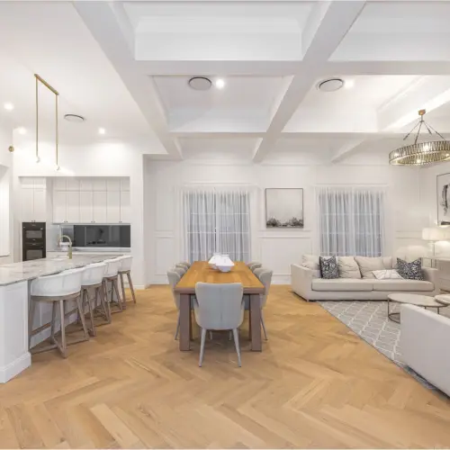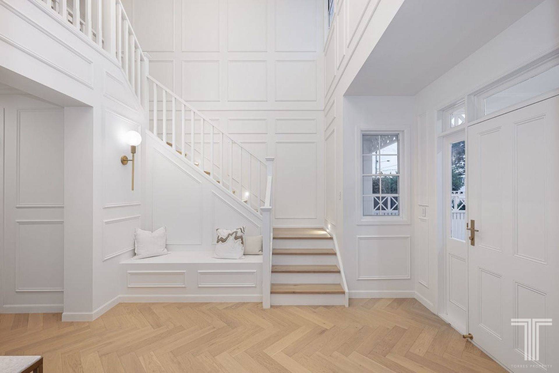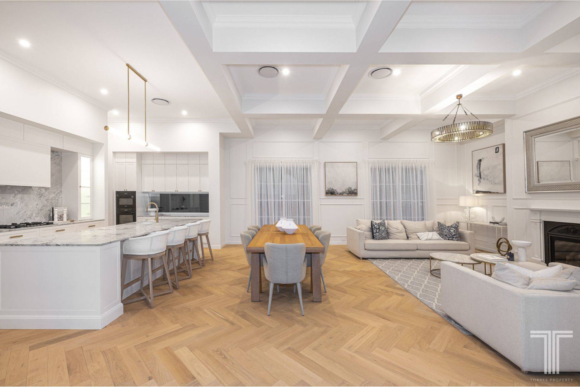 Sunlight streams softly inside, where dashing herringbone timber floors reflect up to the soaring ceilings across to the wainscoting walls and other impeccable finishes that embrace every angle on both levels.