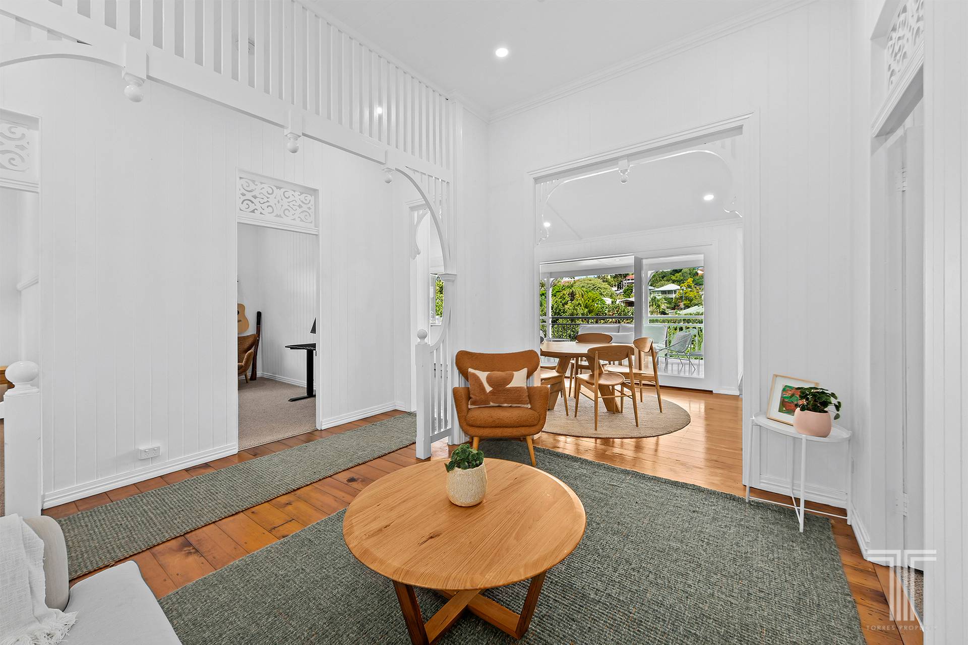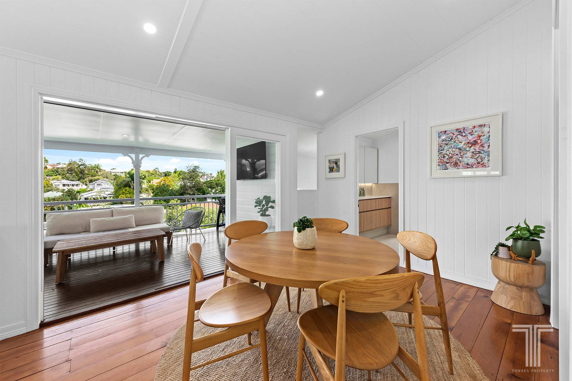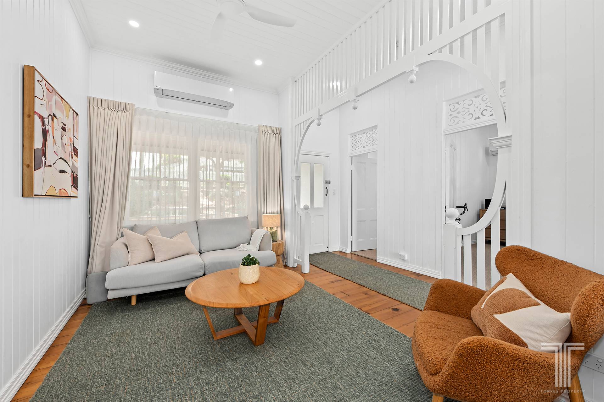 Beyond the entrance, timeless Queenslander character blends effortlessly with modern living. High ceilings and VJ walls with decorative detailing preserve the home's personality, while refreshed paintwork and thoughtful renovations create a light, airy feel throughout. The kitchen and bathrooms have been completely modernised, delivering contemporary style and everyday practicality. A well-positioned breakfast bar and servery naturally become the hub of daily life, where conversations tend to linger just a little longer.
