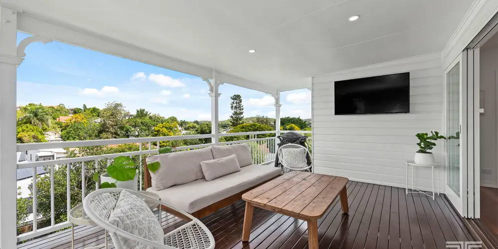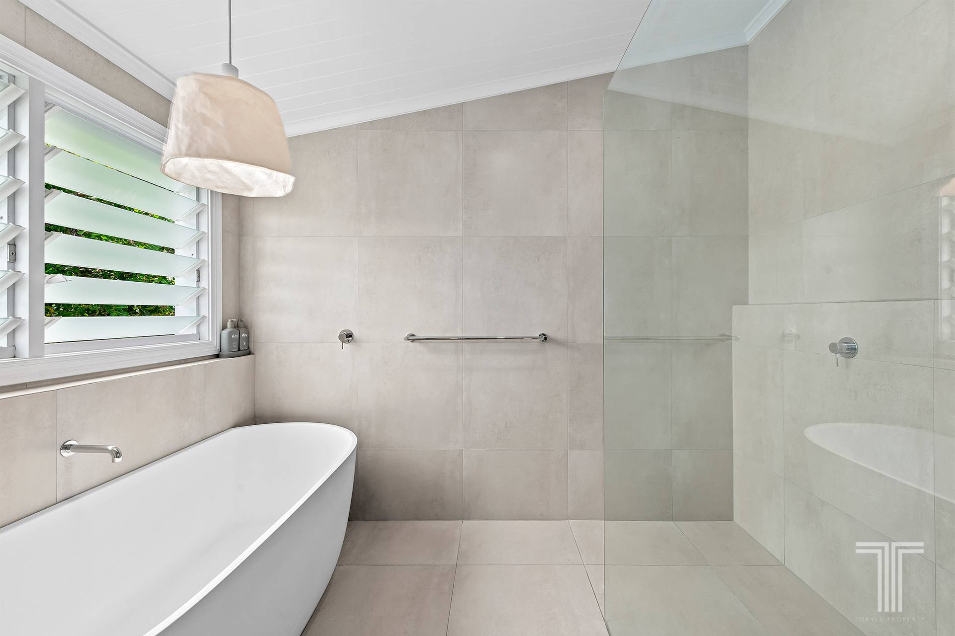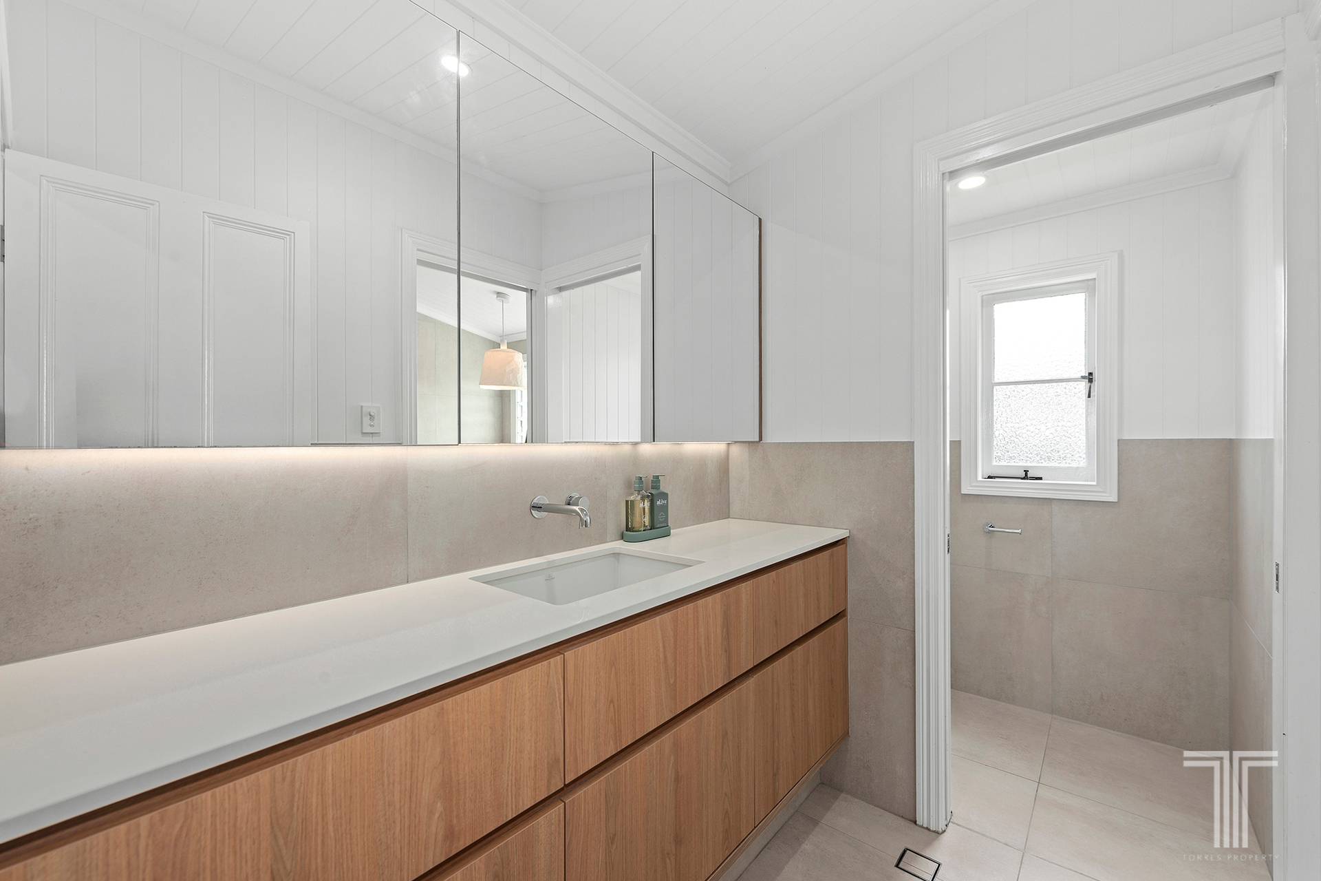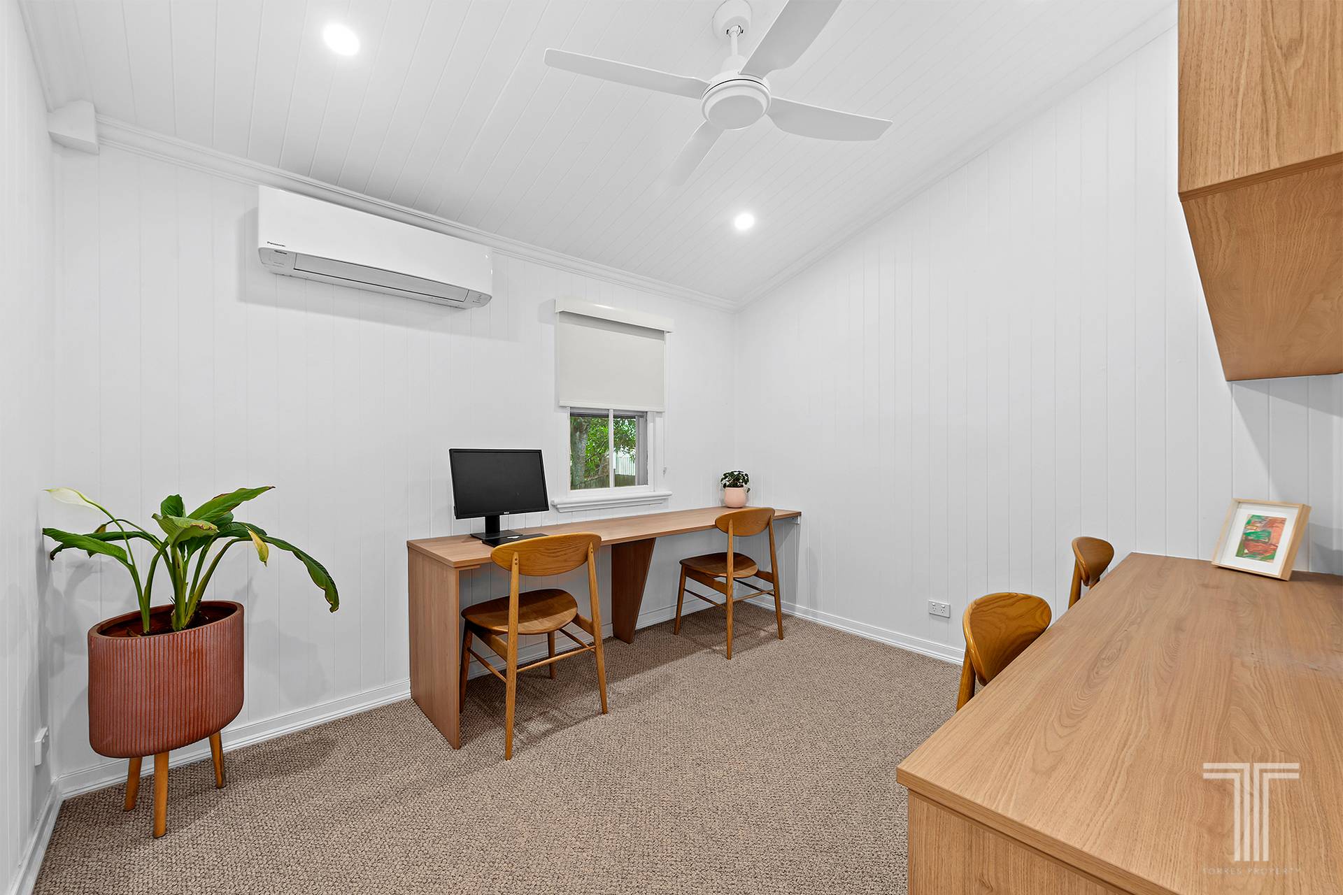 Beyond the entrance, timeless Queenslander character blends effortlessly with modern living. High ceilings and VJ walls with decorative detailing preserve the home's personality, while refreshed paintwork and thoughtful renovations create a light, airy feel throughout. The kitchen and bathrooms have been completely modernised, delivering contemporary style and everyday practicality. A well-positioned breakfast bar and servery naturally become the hub of daily life, where conversations tend to linger just a little longer.