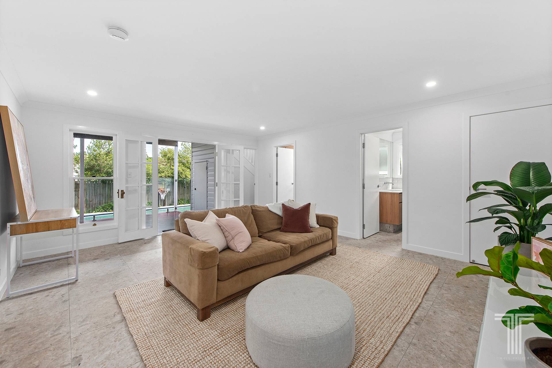 Outdoors, the lifestyle appeal continues. Two spacious decks extend the living areas, including an elevated veranda capturing leafy views across Holland Park. Whether hosting friends or enjoying a quiet morning coffee, the connection between indoors and out feels effortless. The sparkling pool completes the picture, ready for summer afternoons and relaxed weekends.