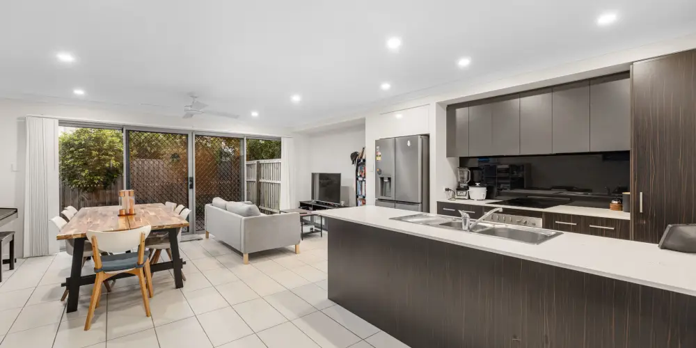 Privately positioned within a popular and well-maintained complex, the home welcomes you with a neat facade and a sense of quiet order. Step inside and the layout immediately feels considered and practical. The entry flows into an open plan living and dining domain where natural light and clean contemporary finishes create an inviting everyday environment. Air conditioning and ceiling fans throughout ensure comfort across all seasons, while the kitchen takes pride of place with quality appliances, generous storage and a design that supports both daily living and easy entertaining.
