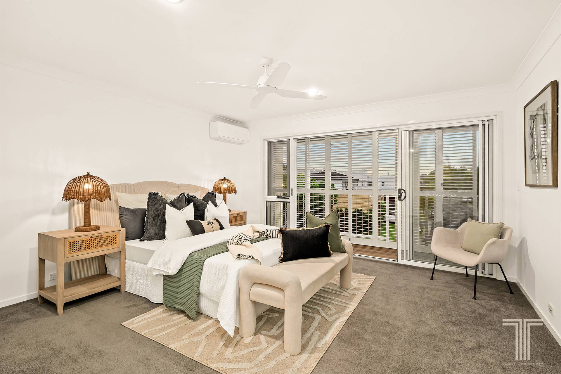 Upstairs, the carpeted staircase brings you to four serene bedrooms, each with built in wardrobes, air conditioning, and ceiling fans. The main suite is a private retreat, complete with an ensuite, built in wardrobe, and sliding doors to a private balcony overlooking the gardens. The main bathroom combines a shower and bath, perfectly serving the family spaces.