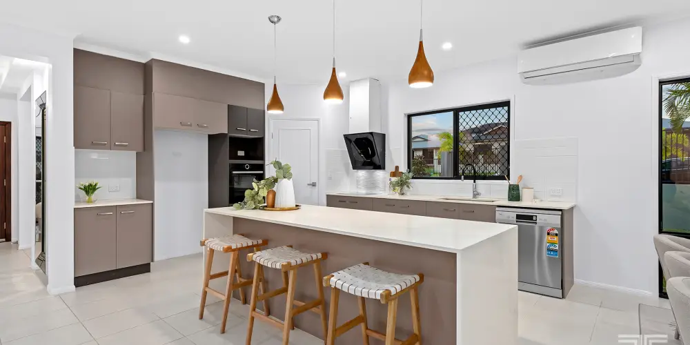 Composed over a single level beneath soaring 2.68-metre ceilings, the layout effortlessly balances connection and separation, with a collection of living and dining areas creating an expansive yet harmonious interior with access to the stone-topped kitchen featuring modern appliances and an island bench illuminated by pendant lights.