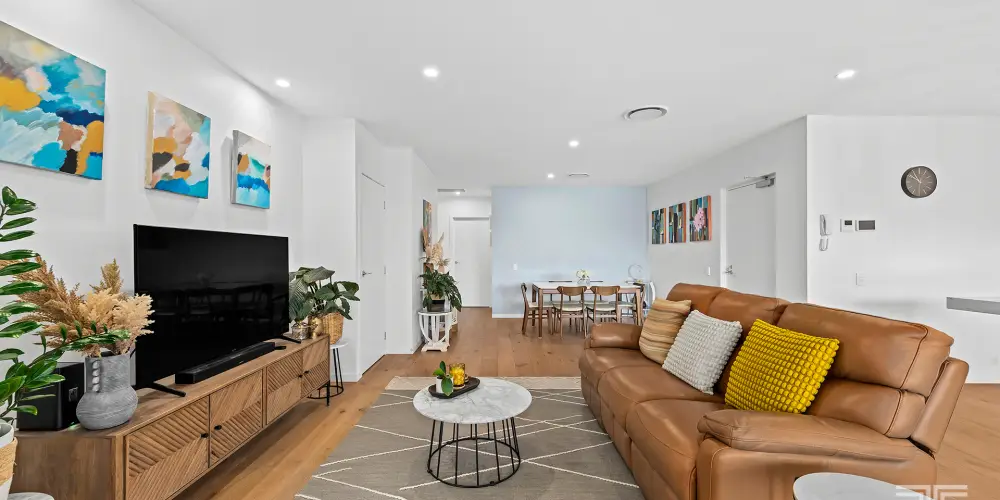 Accommodation is equally impressive. Plush carpeted bedrooms are appointed with built in robes, while ducted air conditioning and ceiling fans throughout promise year-round comfort. The main suite offers a private retreat, complete with a double vanity ensuite, expansive walk in wardrobe and floor to ceiling tiling that evokes a boutique hotel aesthetic. The second bathroom mirrors this same commitment to quality, while an oversized laundry adds a practical luxury rarely found in apartment living.