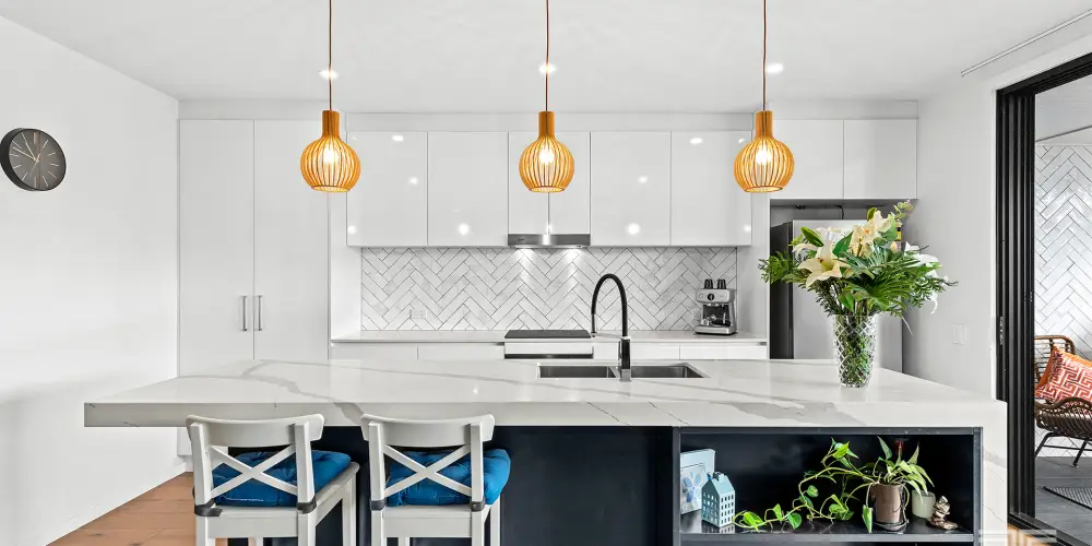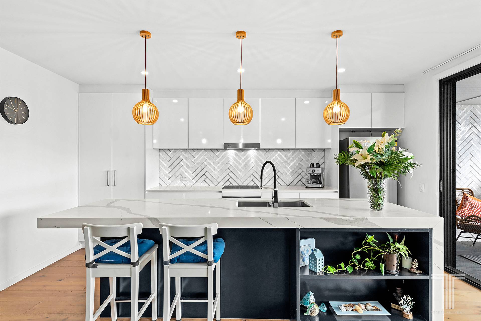 Step inside and the warmth of European composite flooring immediately anchors the home. Natural light pours through expansive glazing, illuminating generous proportions and a layout designed for both relaxed evenings and effortless entertaining. The kitchen is a centrepiece in every sense. Anchored by a striking 75mm stone island with waterfall edge, it pairs beauty with practicality. A 600mm ILVE oven, four plate electric cooktop and ILVE dishwasher cater to the most enthusiastic home chef, while the herringbone splashback, extensive cabinetry and plumbing for the fridge ensure every detail has been thoughtfully resolved.