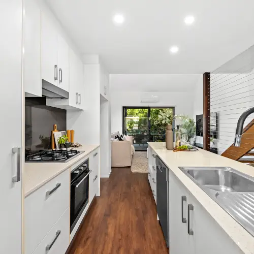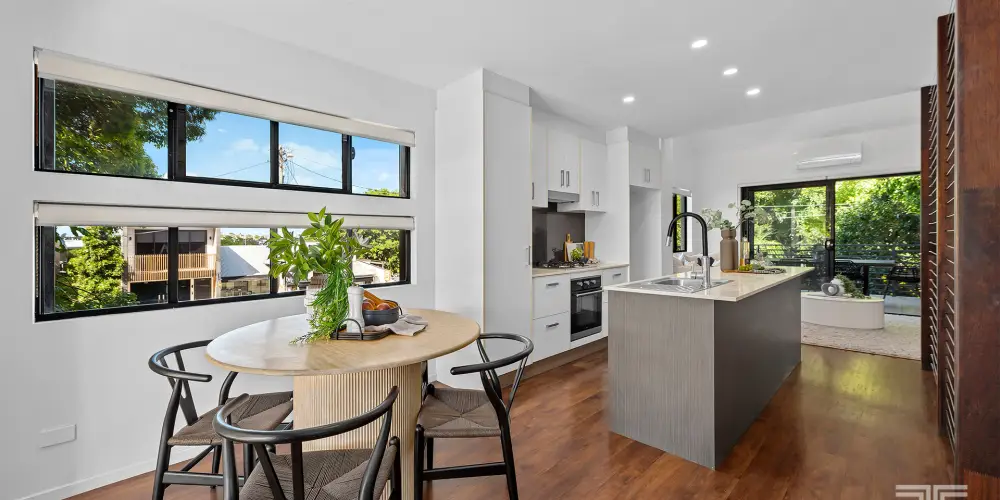 Upstairs, the second level reveals the true heart of the home. Designed as a central gathering space, the open plan living, dining and kitchen area feels both welcoming and effortless. The kitchen is finished with stone benchtops, quality appliances and a gas cooktop, delivering both style and everyday functionality. Natural light filters through large windows, while leafy green outlooks soften the urban setting.