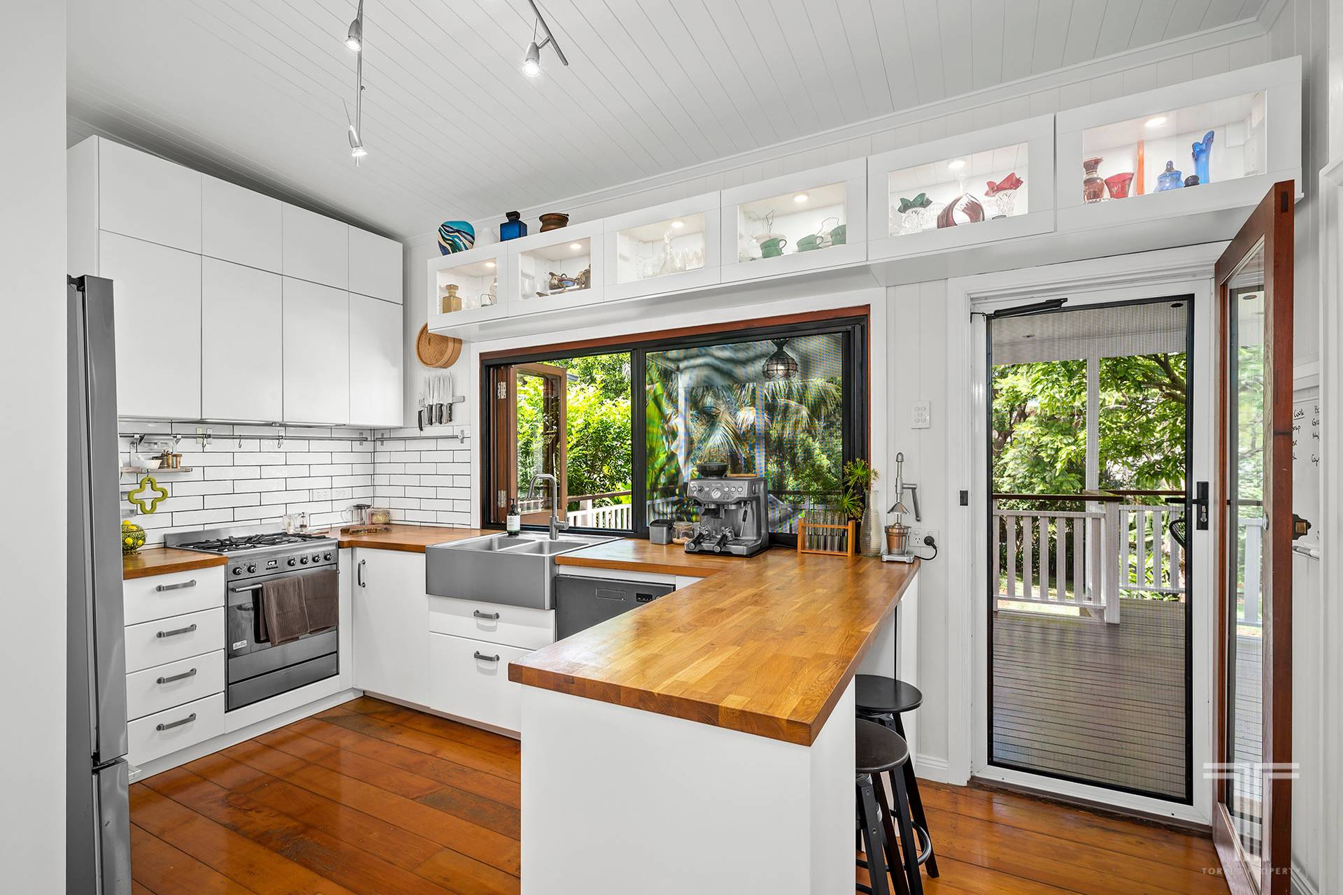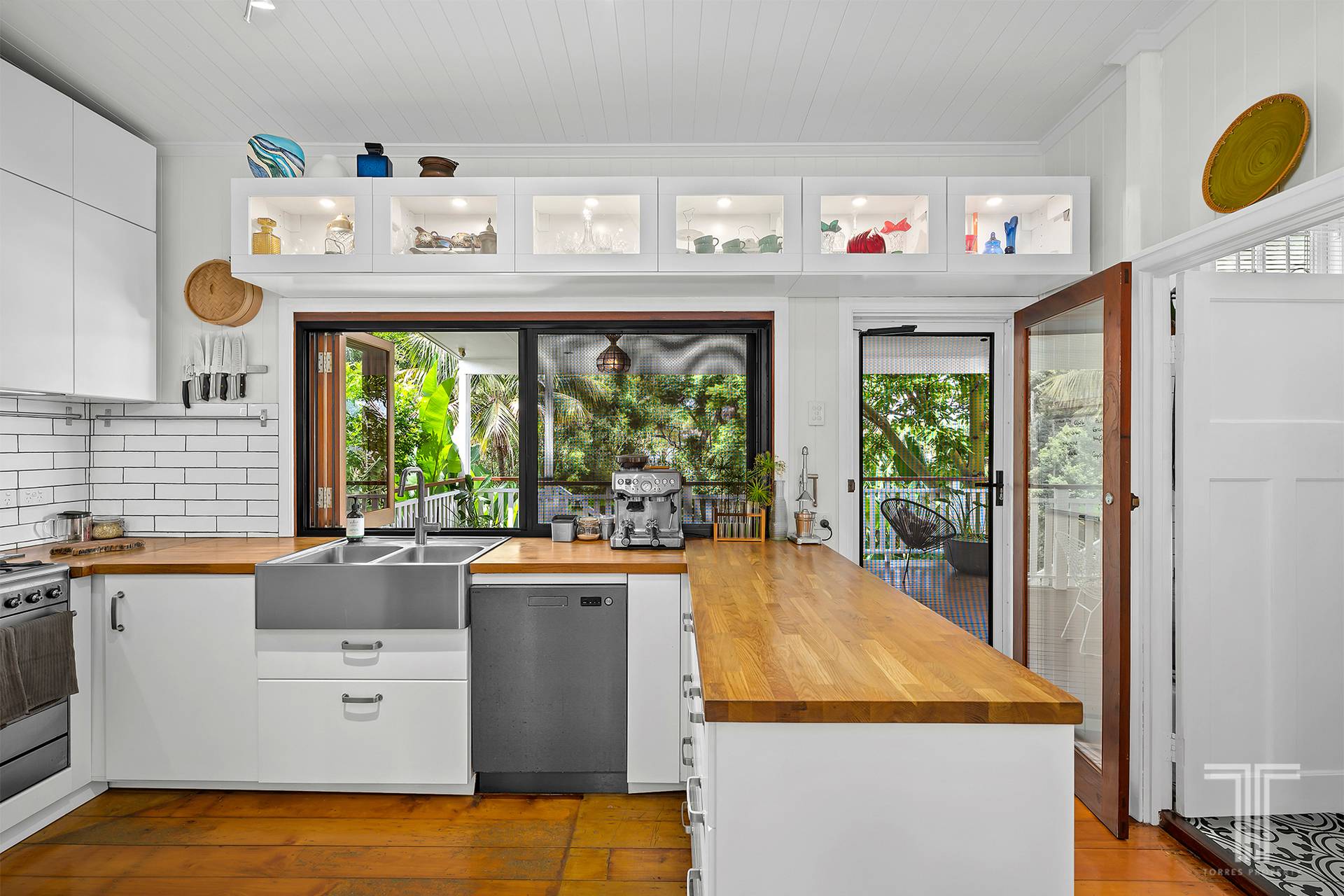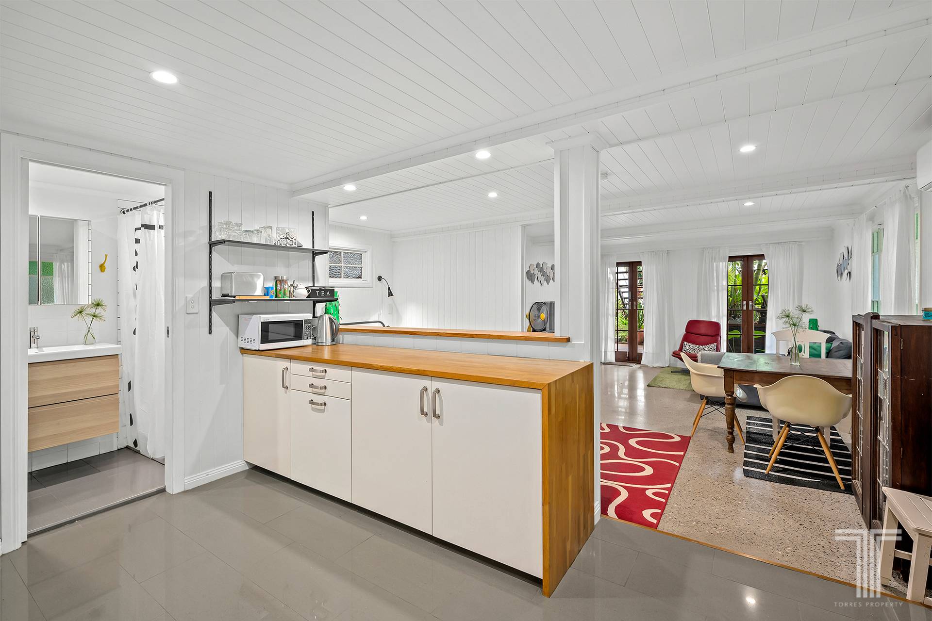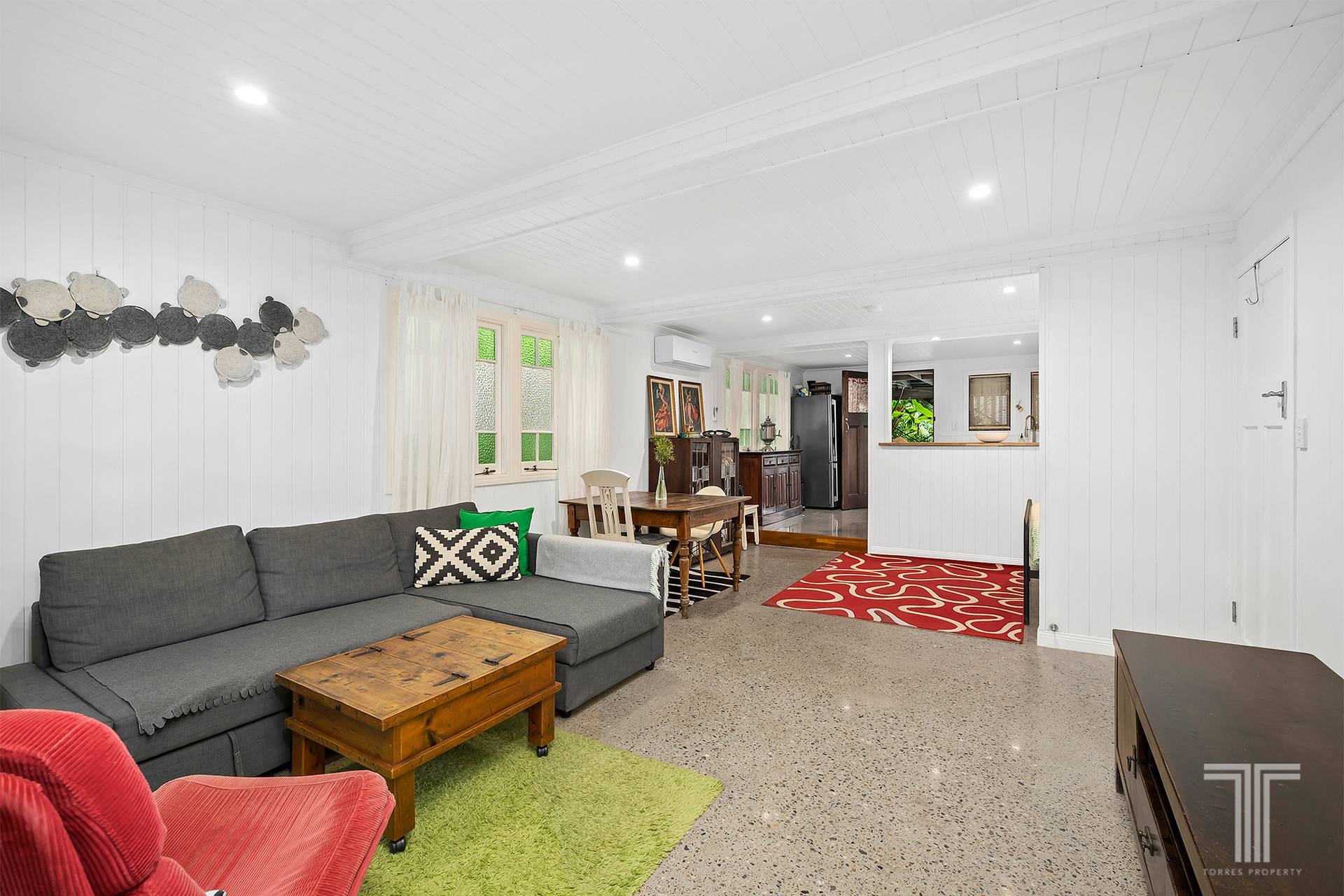 Inside, traditional details take centre stage. Casement windows invite in soft natural light, VJ walls tell stories of craftsmanship, and soaring 3.2m ceilings enhance the sense of space. Timber floorboards stretch across the upper level, grounding the home in warmth and authenticity, while the mechanically polished slab downstairs reveals an impressive exposed aggregate. The living and dining area unfolds with ease, offering an open yet intimate setting for both relaxed evenings and lively gatherings.