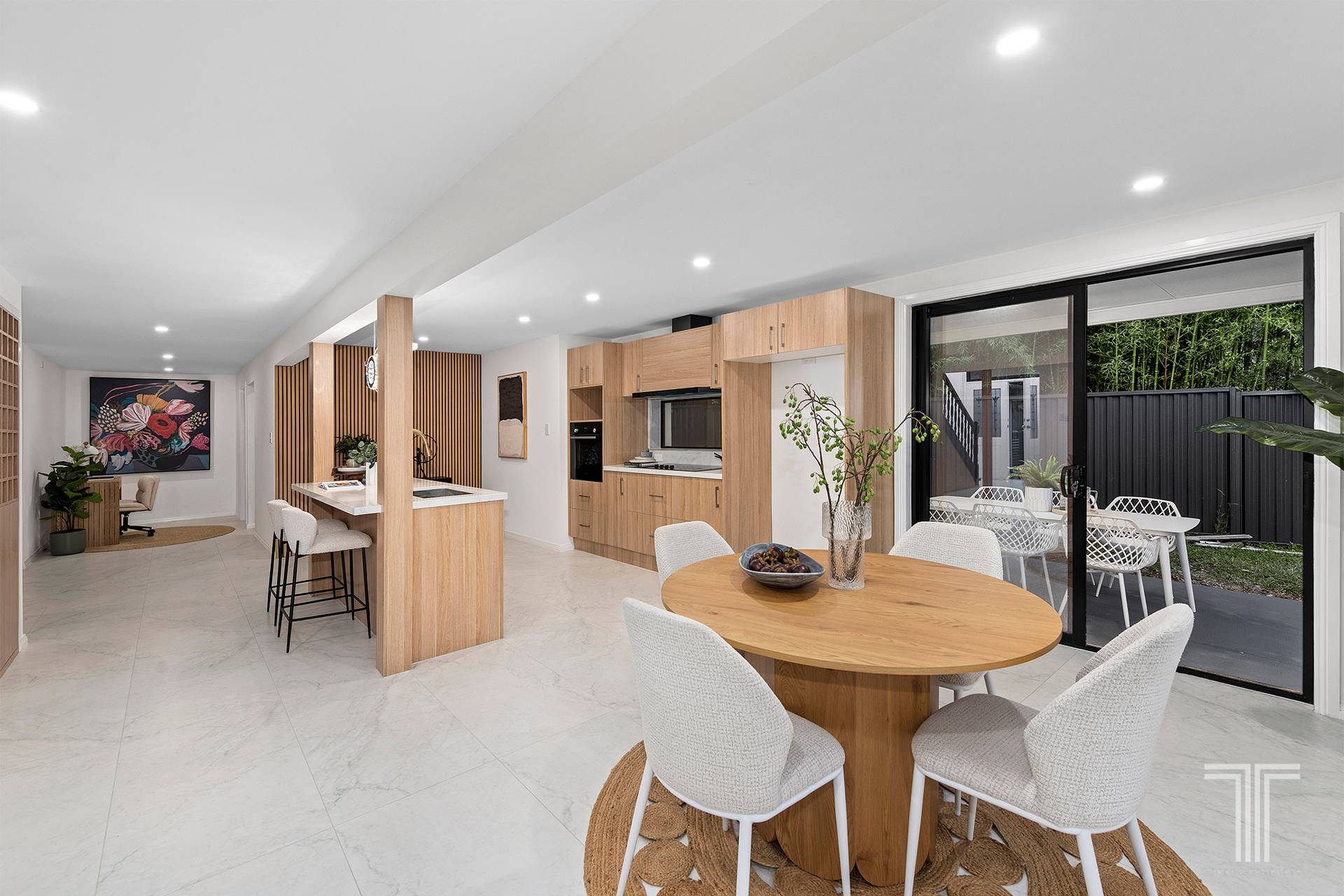 Stepping inside, the sense of renewal becomes immediately apparent. Clean architectural lines, generous natural light and carefully selected materials create interiors that feel bright, calm and quietly refined. Large format floor tiles extend across the main living level, while brand new aluminium windows and sliding doors with double glazed glass enhance comfort, insulation and everyday tranquillity.