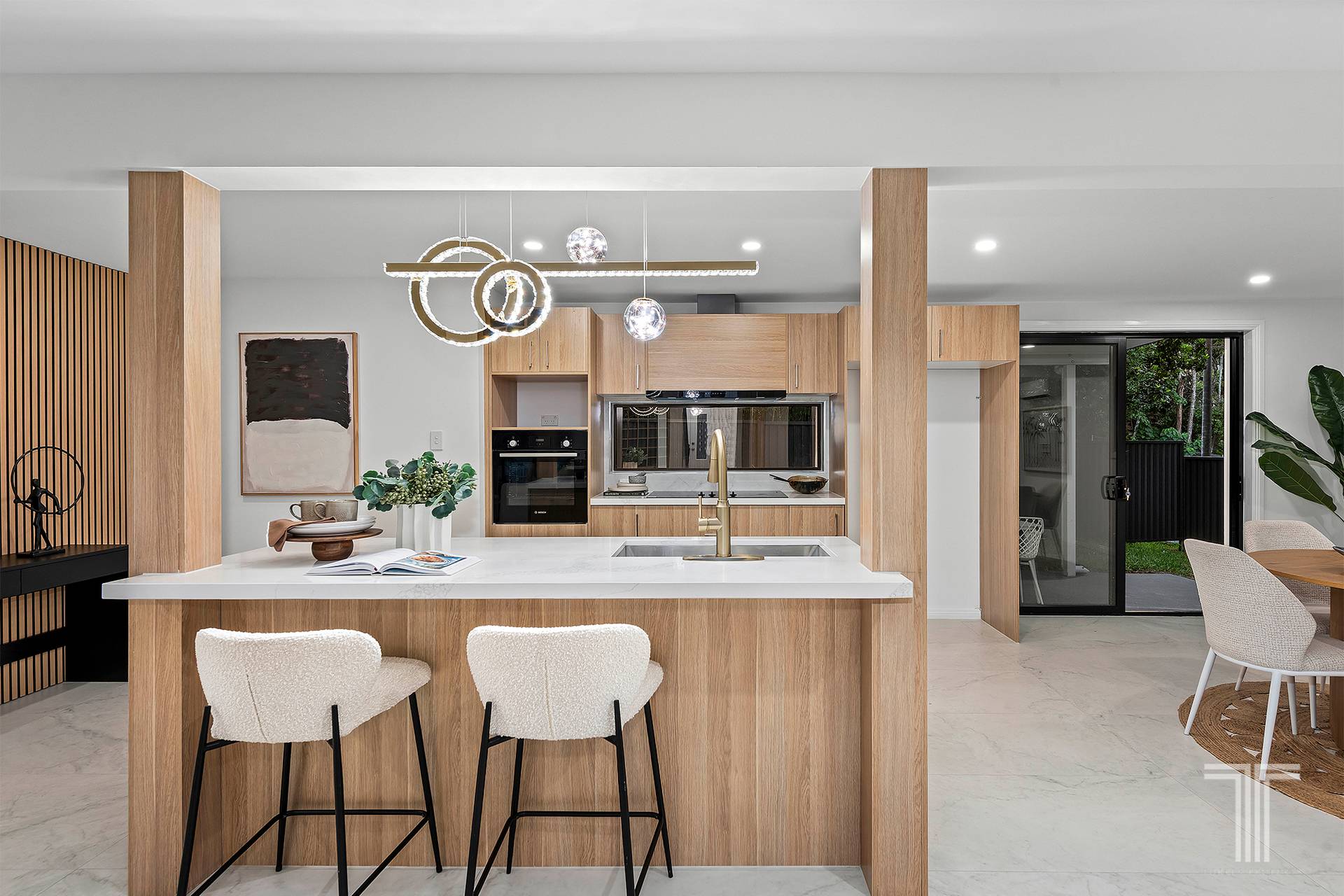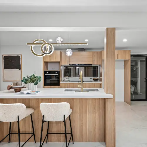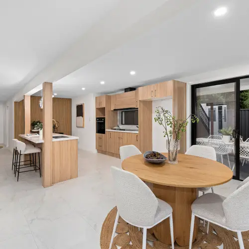 The ground floor unfolds as a welcoming hub where the kitchen, dining and living areas connect seamlessly. At the centre of the space sits the newly appointed kitchen, finished with premium cabinetry and a substantial 40mm stone benchtop that provides both visual impact and practical workspace. Quality appliances including a Bosch oven, Westinghouse cooktop, Samsung dishwasher and LG rangehood support effortless everyday cooking, while thoughtful details such as wine storage and concealed under stair storage add further practicality.