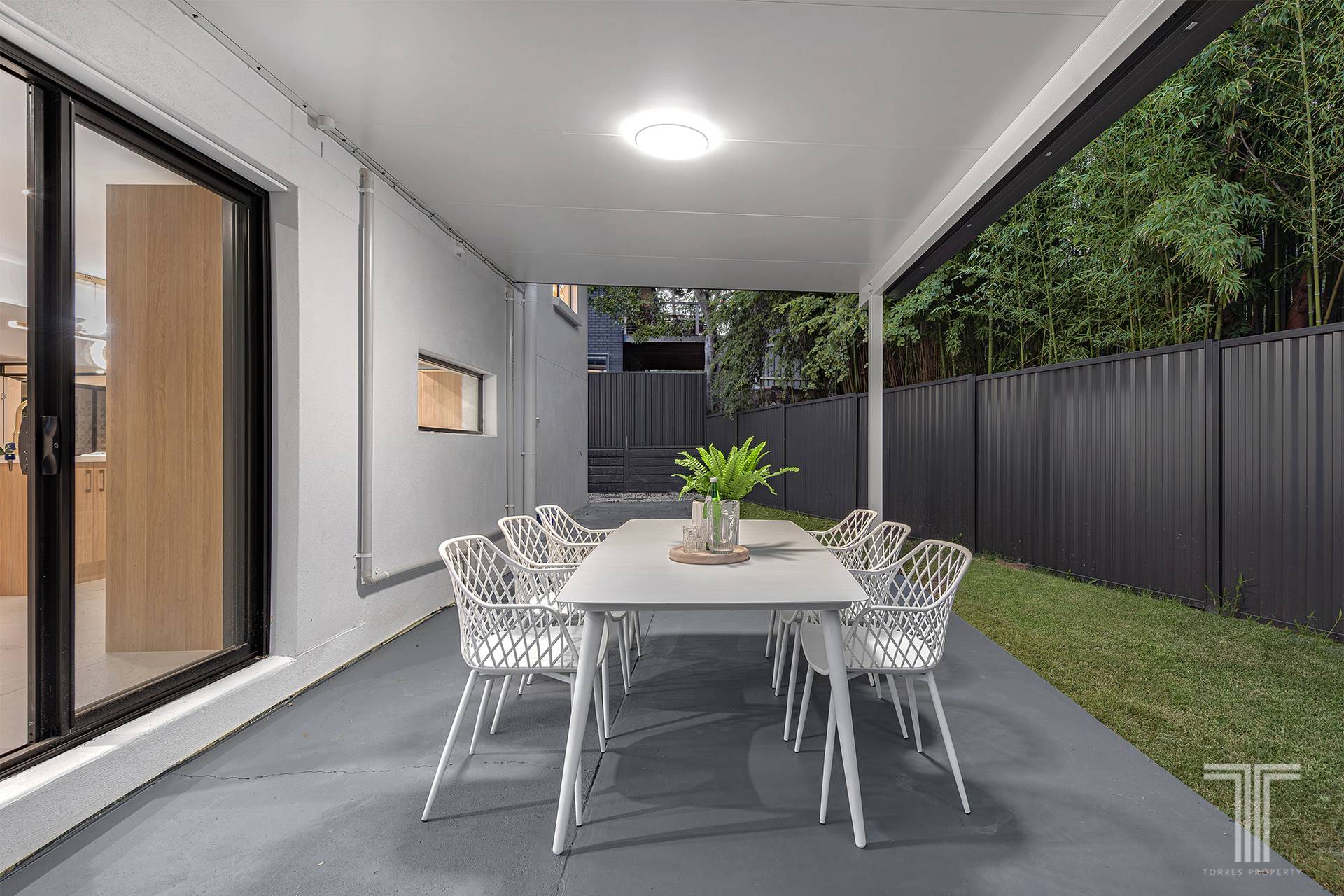 The backyard entertaining patio, complete with insulated roofing panels, creates a comfortable outdoor dining and barbecue space suited to relaxed weekend gatherings. Solar lighting positioned along the fencing enhances the evening atmosphere, while the new carport with insulated roofing panels and remote-controlled garage door provides secure parking.
