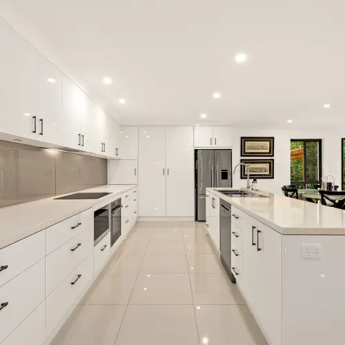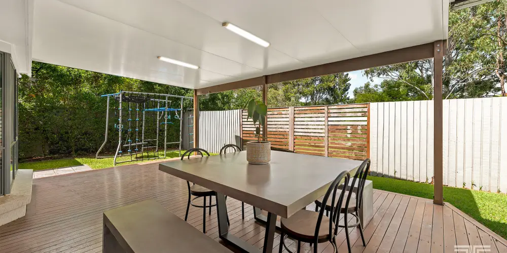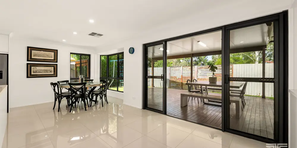 The kitchen and main living spaces connect seamlessly through large black framed sliding doors to the covered rear entertaining deck. Finished with insulated panel roofing, this outdoor space is perfectly designed for gatherings with friends and family while overlooking the private backyard.