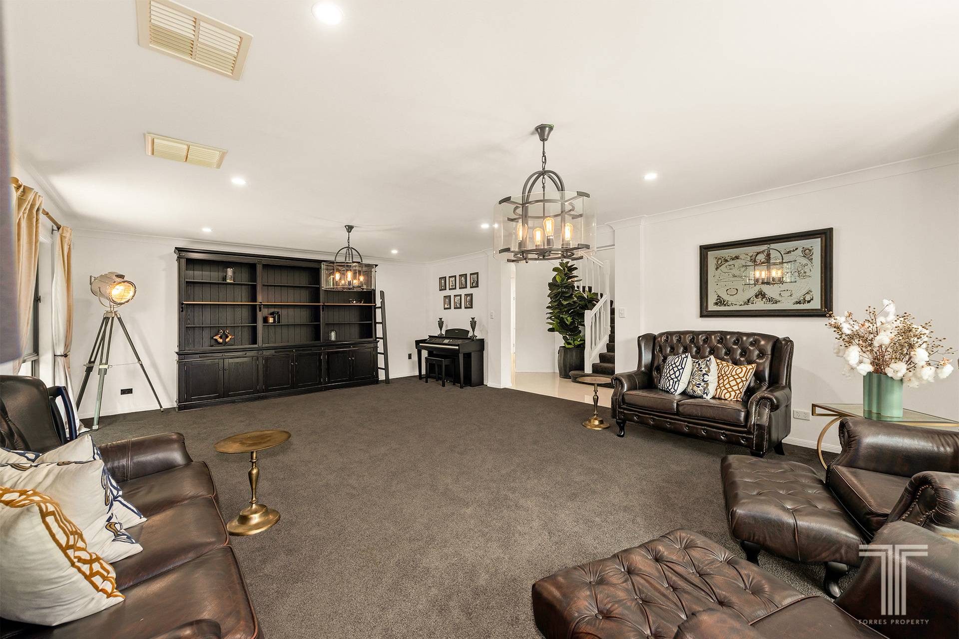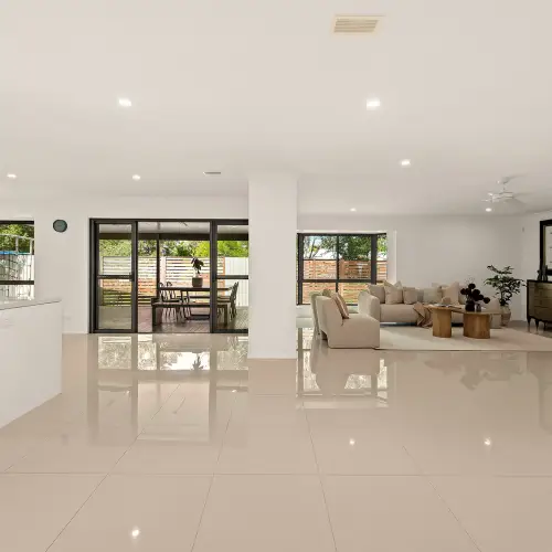 Stepping inside, the home reveals an expansive and well considered layout designed with family living in mind. Large tiled flooring flows throughout the ground level, complemented by a fresh neutral palette that creates a clean canvas ready for its next owners to make their own. The lower level is centred around a generous open plan living and dining zone, designed to comfortably accommodate both everyday family life and larger gatherings, with natural light filtering through the space to enhance the sense of openness.