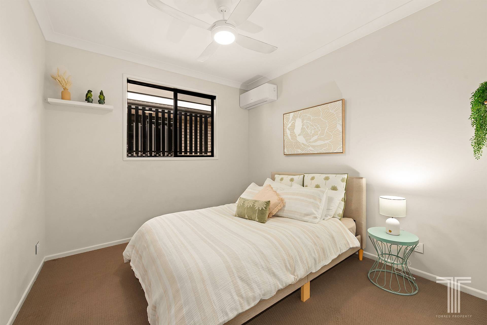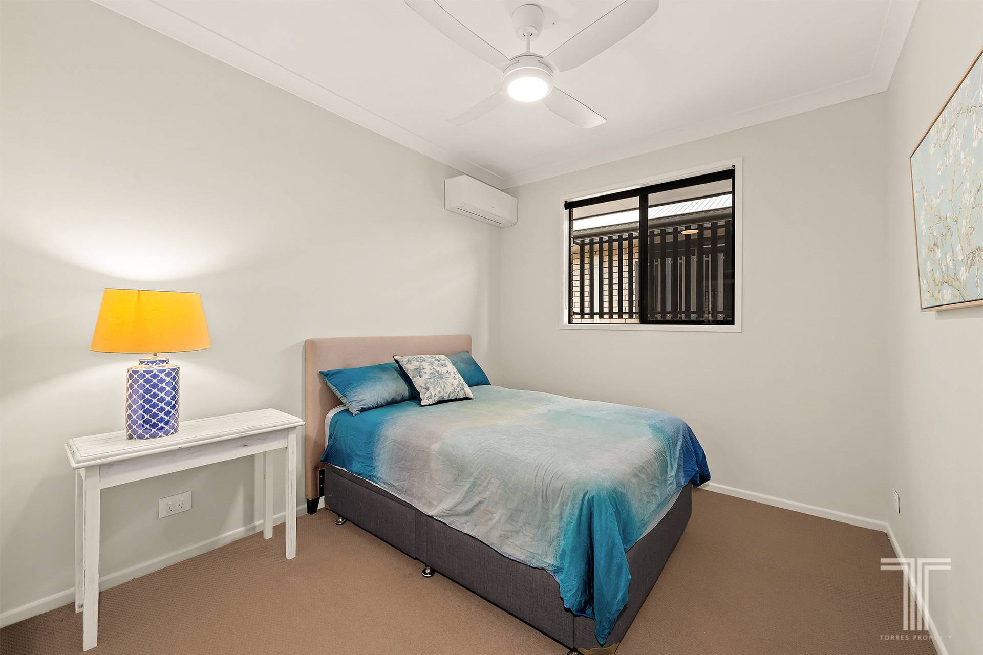 Upstairs, the accommodation is well-zoned and comfortably appointed. Carpet underfoot softens the spaces, while ceiling fans and air conditioning ensure year-round comfort for the Queensland climates. The master bedroom is a true standout, generously scaled and offering an abundance of room that goes beyond expectation. Each additional bedroom is well-proportioned, ideal for growing families or those needing flexibility.