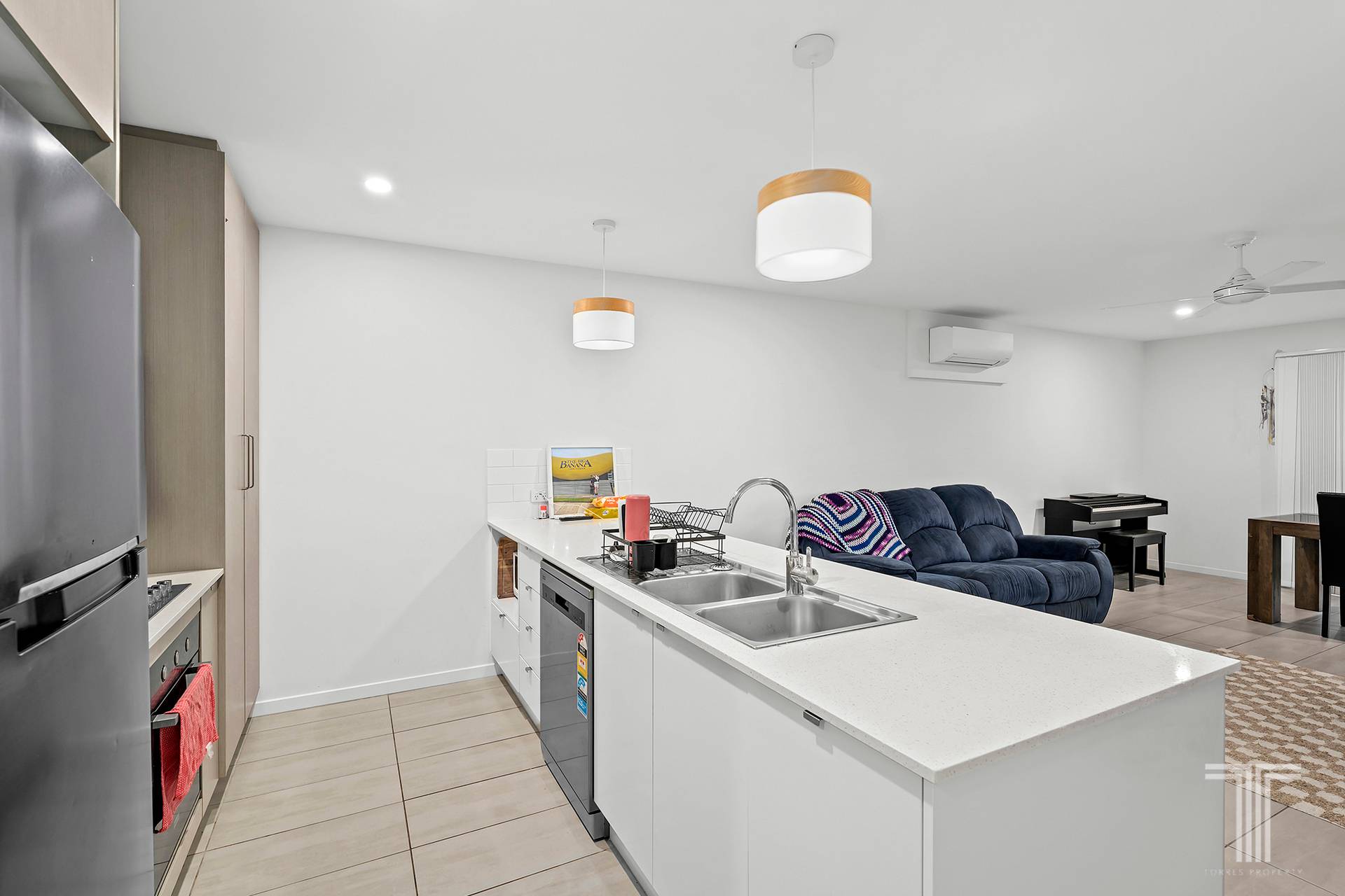 Inside, the layout unfolds with simplicity and purpose. Tiled flooring flows through the main living zones and walkways, offering durability and ease of upkeep, while a neutral palette enhances the sense of light and space. The kitchen sits at the heart of the home, well-appointed with stainless steel appliances and designed to connect seamlessly with the open plan living and dining area. It is a space that comfortably supports both everyday routines and relaxed entertaining.