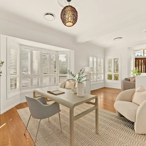 Stepping inside, the home reveals a bright and beautifully maintained interior, where natural light moves easily through a clean, neutral palette. The layout feels intuitive and well considered, offering multiple living zones that allow for both connection and separation as needed. A bay window adds a layer of charm to one of the living spaces, with plantation shutters filtering the light and enhancing the home's relaxed feel.