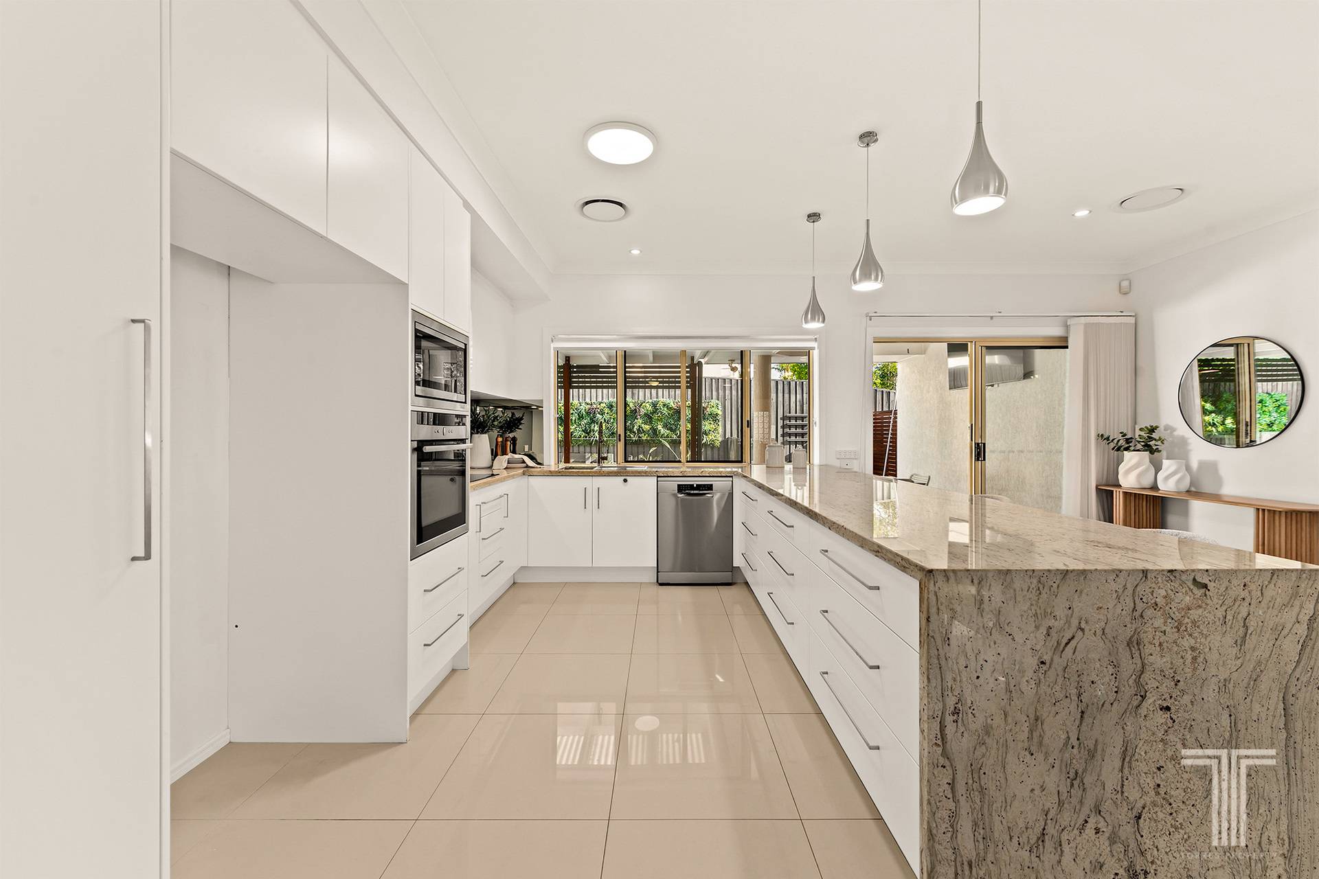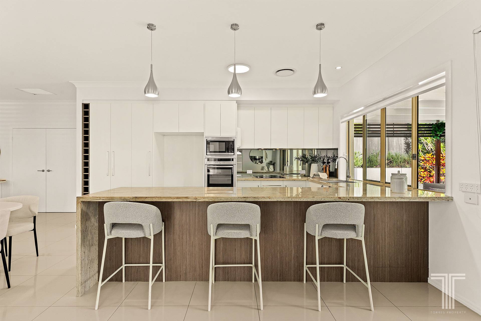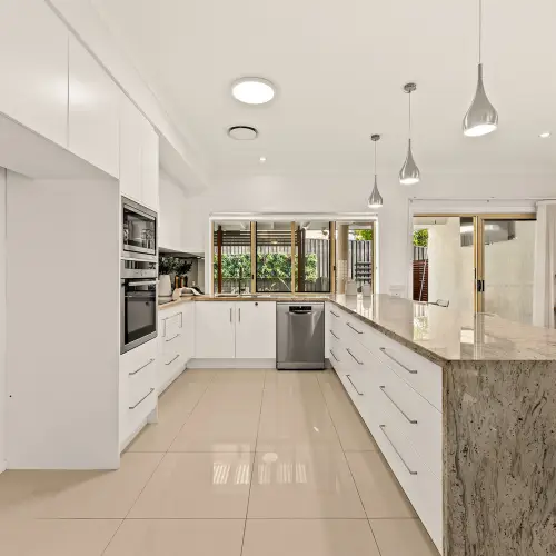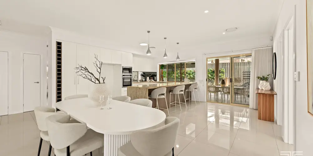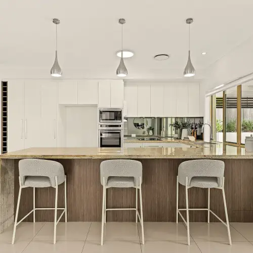 At its centre, the kitchen is both practical and visually striking. A statement stone benchtop with bold veining and a waterfall edge anchors the space, creating a natural gathering point for everyday living. Quality appliances and excellent storage complete the picture, while the seamless connection to surrounding living and dining areas ensures the home feels cohesive and easy to navigate.