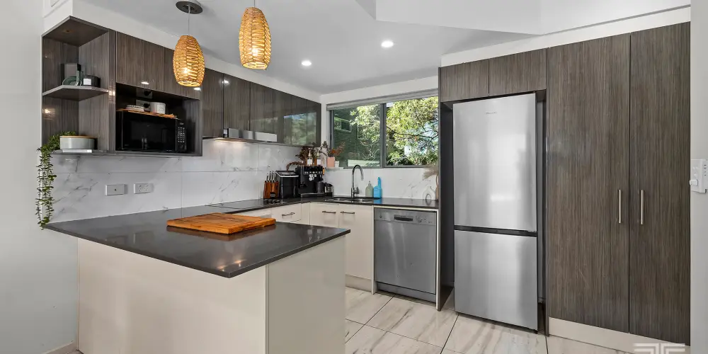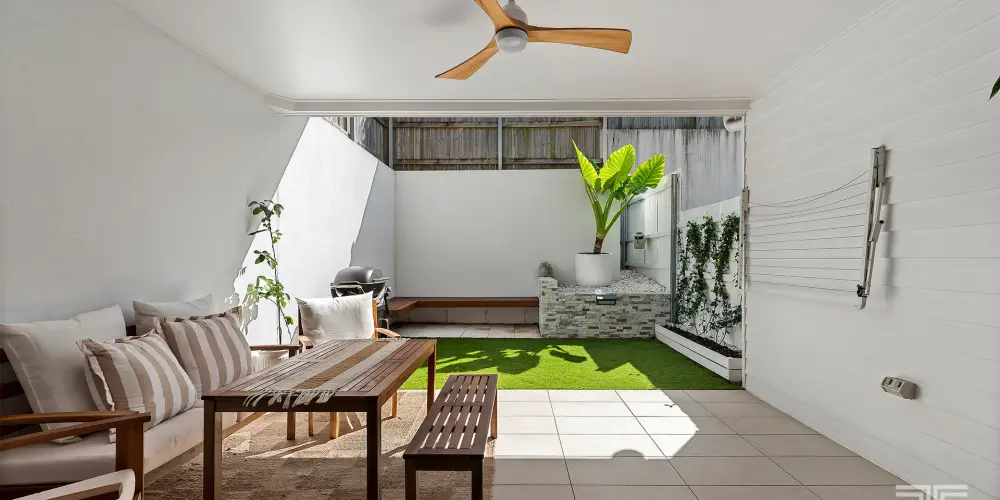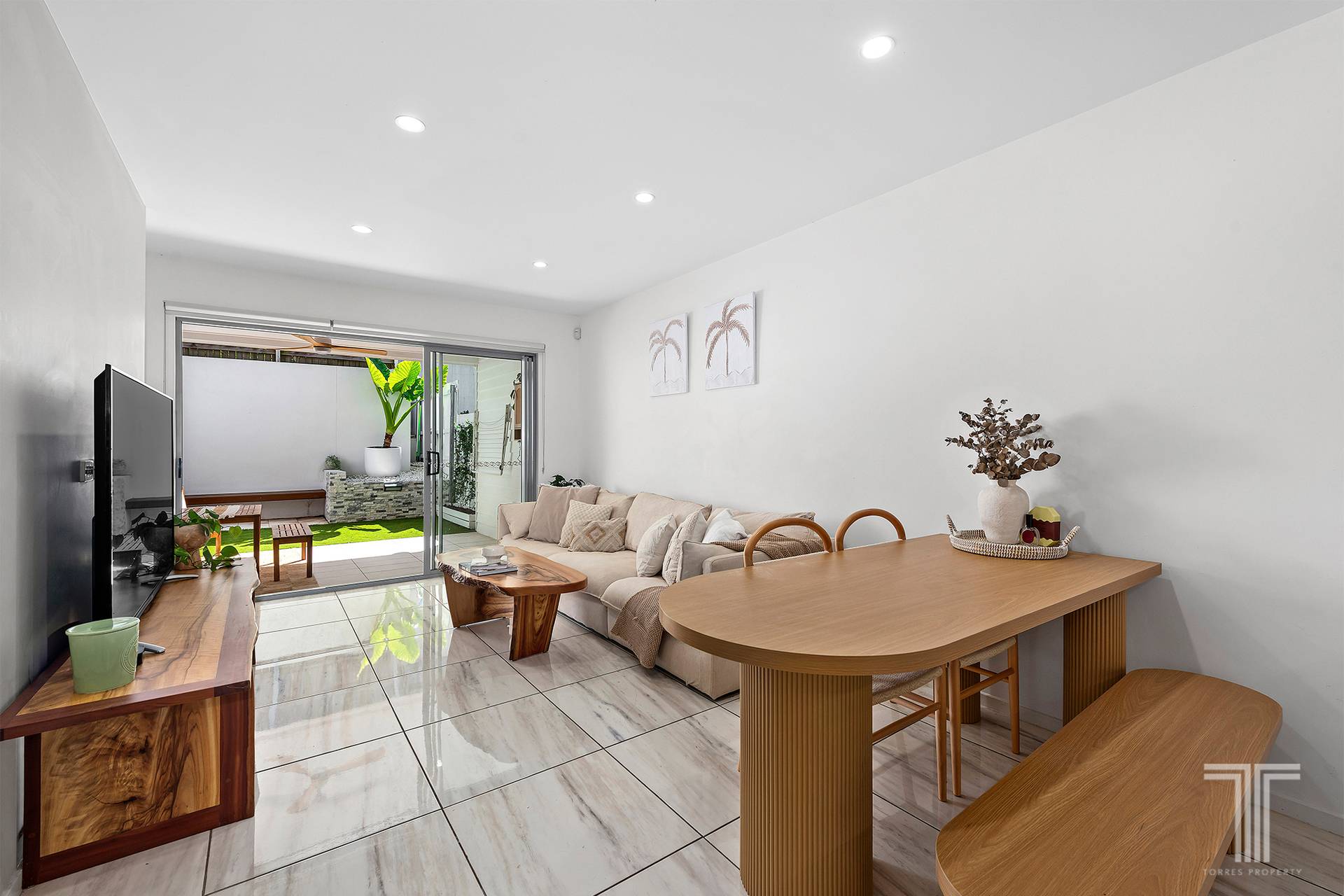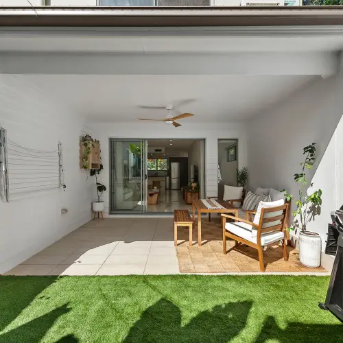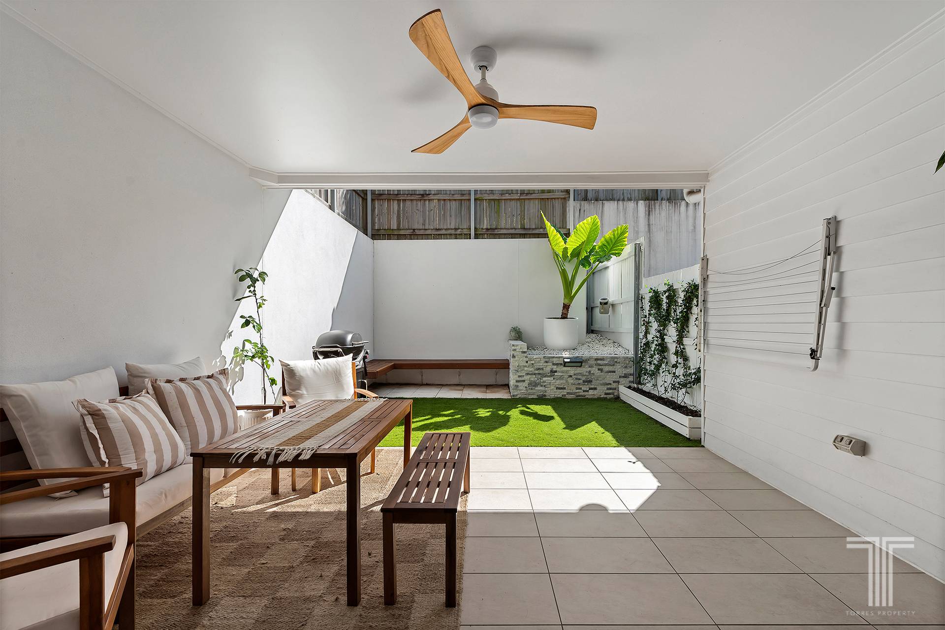 Stepping inside, the first floor contains a spacious and well-appointed living and kitchen zone, where tiled flooring and a neutral palette create a clean, easy-living foundation. The kitchen is both practical and generous, offering ample bench space, excellent storage and an stainless steel appliances & electric cooktop, all designed to support everyday living and relaxed entertaining. Flowing seamlessly from the interior, a covered outdoor entertaining area extends the living space, complete with built-in corner seating and an astro-turfed courtyard that feels both private and inviting.
