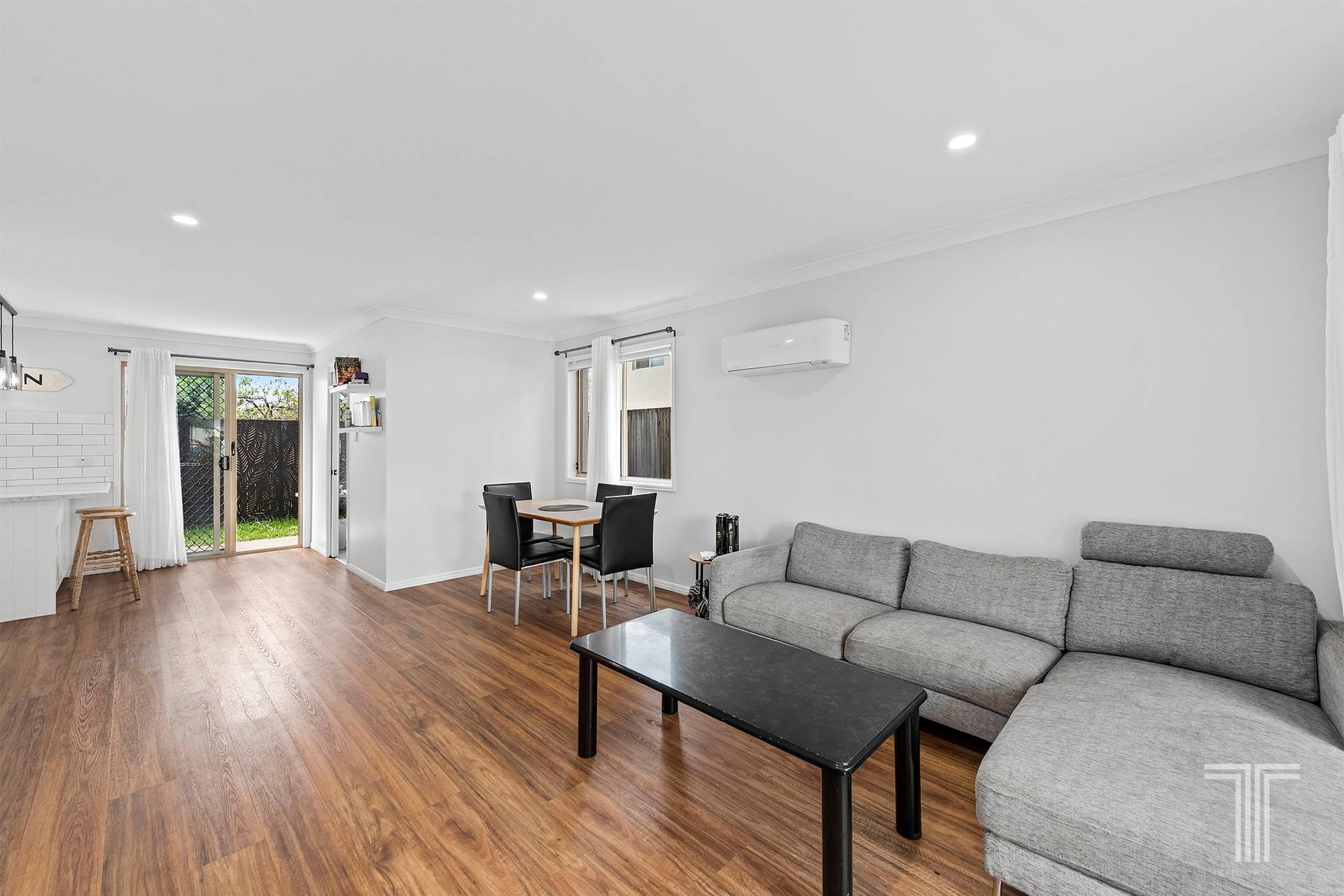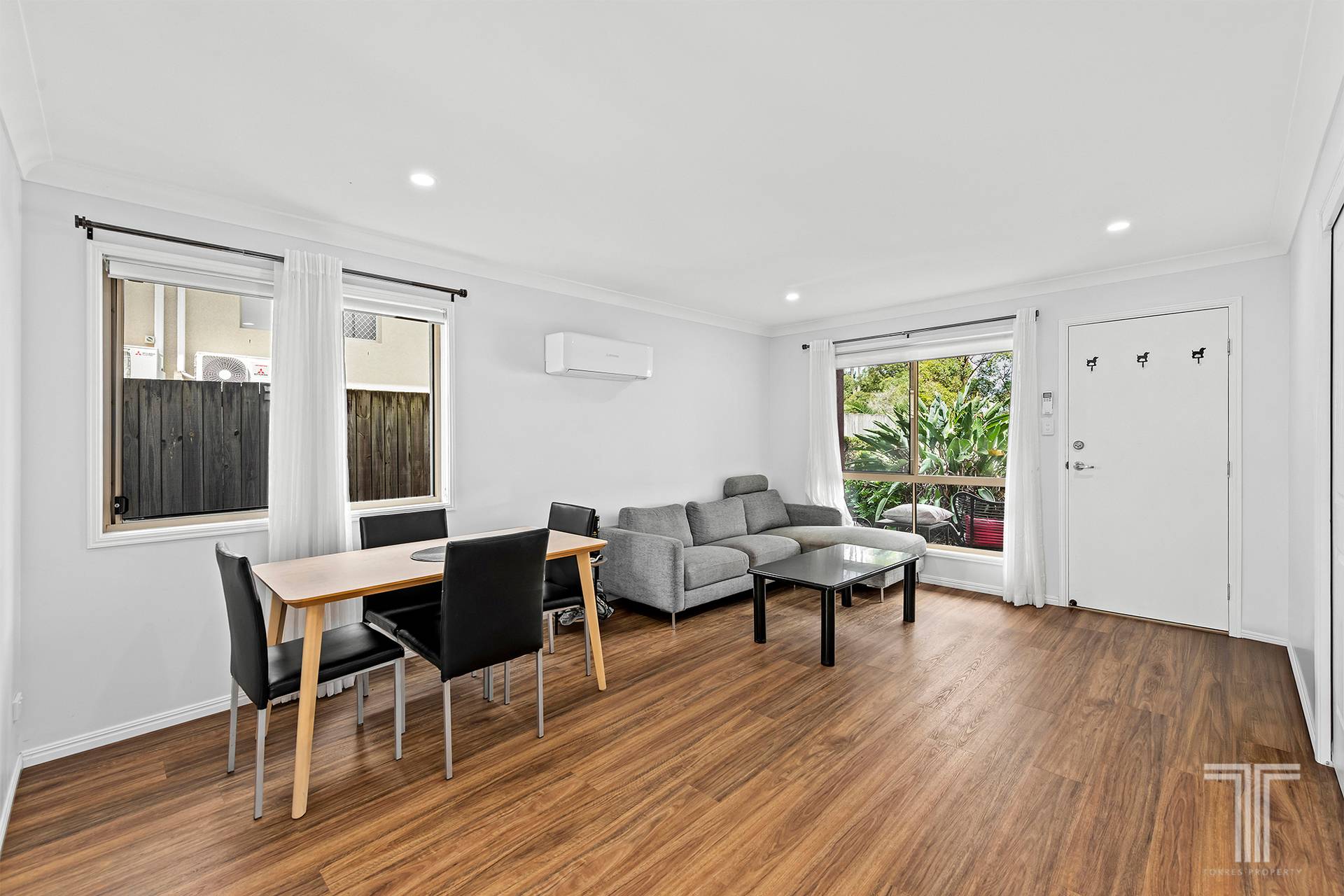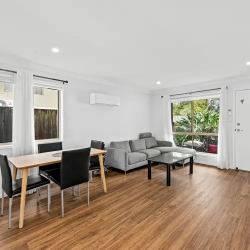 72/20–39 Johnston Street, Carina is a beautifully renovated townhouse in a park-facing location, offering comfort, style and low-maintenance living. The home has been fully updated, creating a fresh and modern space that is ready to enjoy. The ground floor features durable hybrid flooring and an open plan layout that connects the living, dining and kitchen areas in a practical and easy-flowing design.