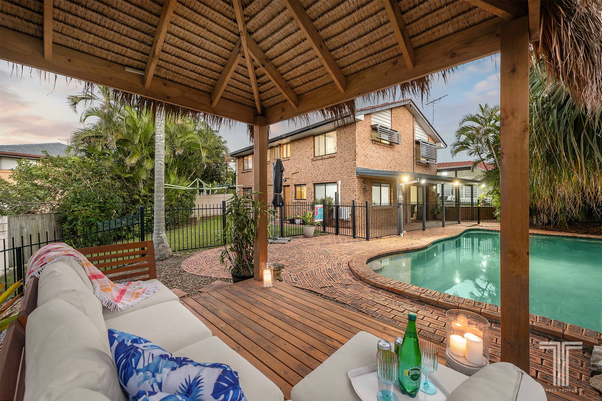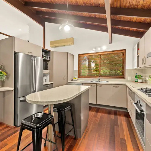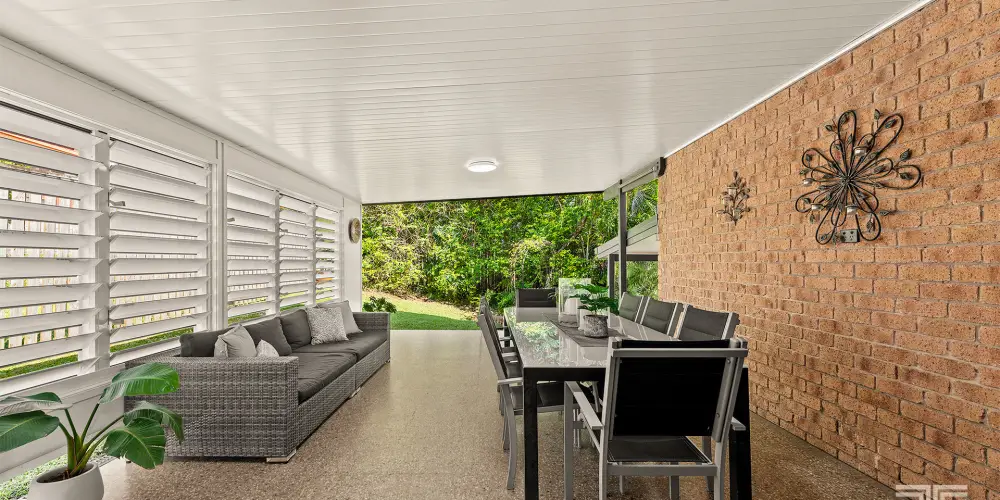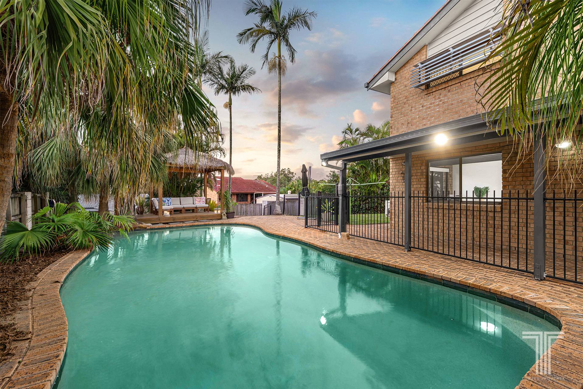 Flowing from the dining area, large timber bifold doors open to a covered alfresco space, offering yet another setting to host, unwind or simply enjoy the Queensland climate. Beyond, the backyard transforms into a private retreat, where a generous in-ground swimming pool takes centre stage. Framed by tropical greenery and complemented by a Balinese-style gazebo, the space evokes a relaxed, resort-like atmosphere that feels worlds away from the everyday.