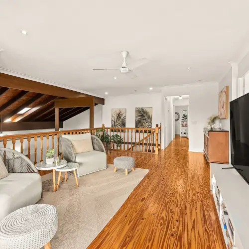 Step inside and the split-level design unfolds with purpose, offering multiple living zones that cater to both family life and quiet retreat. Soaring raked ceilings enhance the sense of space, drawing in natural light and creating an airy, open feel across the upper level. Timber floorboards add warmth underfoot, while the kitchen anchors the home with 40mm stone benchtops and a layout that connects seamlessly to the dining and living areas. Upstairs, four well-appointed bedrooms, including a spacious master retreat complete with walk-in robe and ensuite, serviced by a central family bathroom.