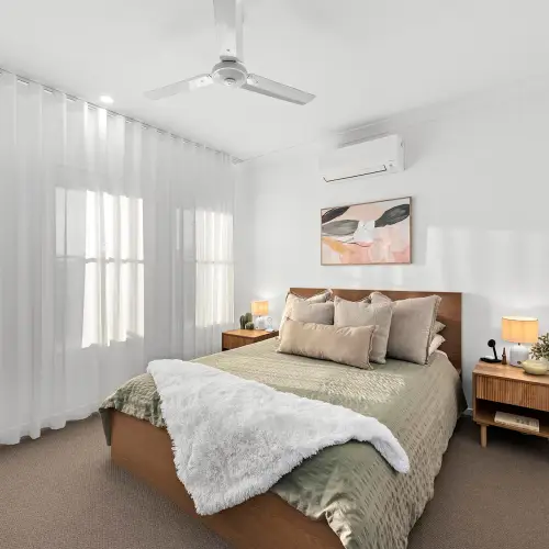Privately positioned, the master suite offers a calm retreat, complete with a spacious walk-in robe featuring his and hers sections and an oversized ensuite with a walk-in shower. The remaining bedrooms are well separated, each fitted with built-in robes and ceiling fans, while the main bathroom is thoughtfully finished with a freestanding bath and separate shower to suit both relaxation and practicality.