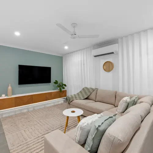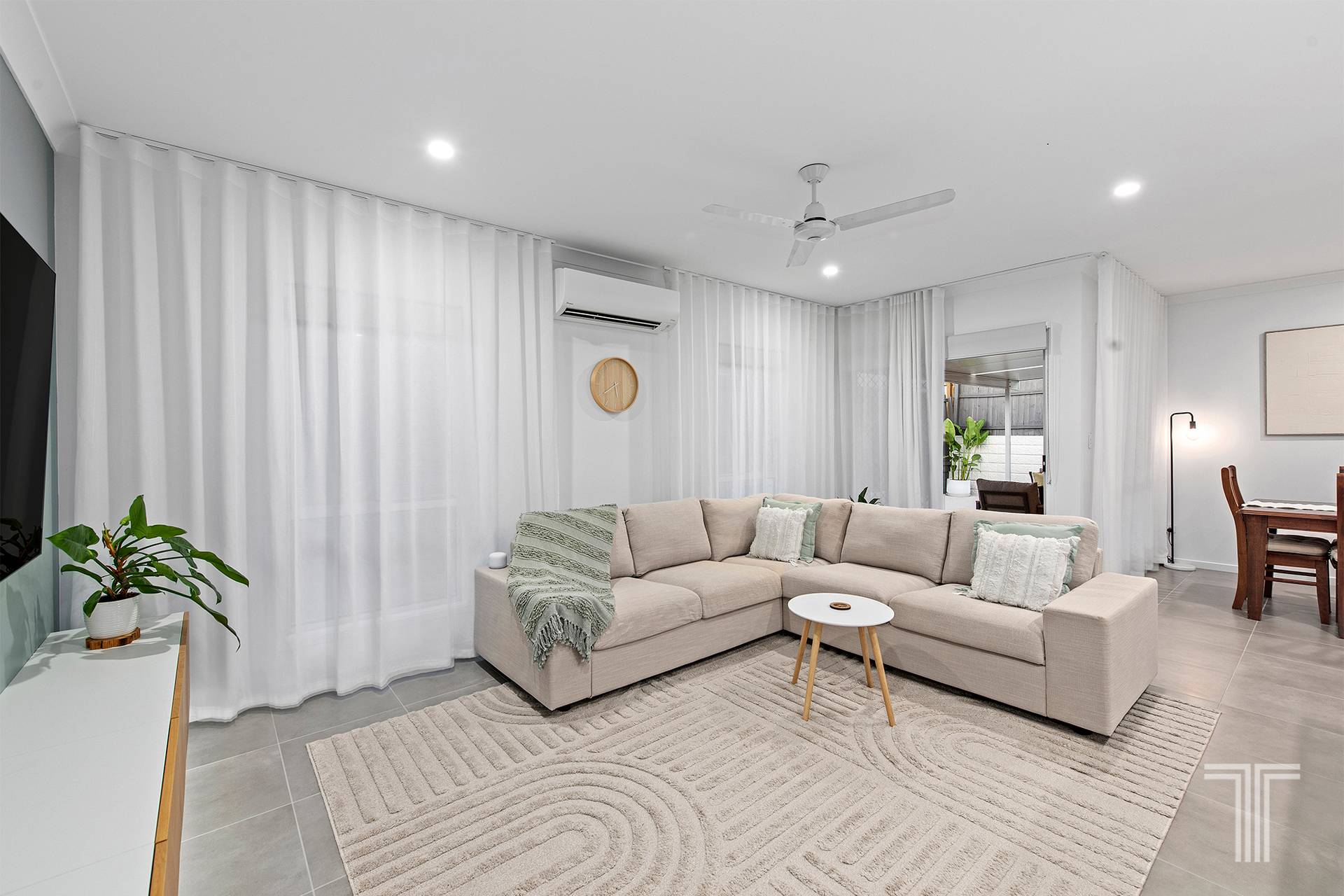 Framed by a fresh white facade and thoughtful landscaping, this single level home immediately sets a tone of clean, contemporary living. The frontage is neat and inviting, with newly defined garden beds and a subtle sense of arrival that continues as you step through the entry. Inside, elevated 2.58m ceilings and large format tiling create an immediate feeling of openness, while soft natural light filters through sheer curtains, adding warmth to the crisp, modern palette.
