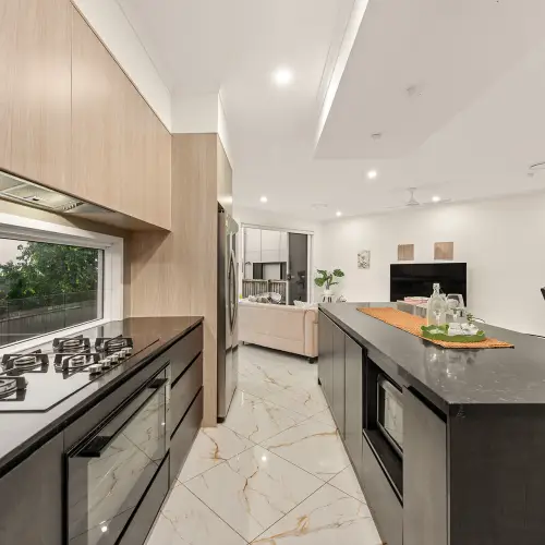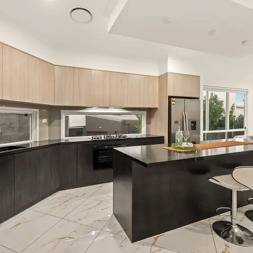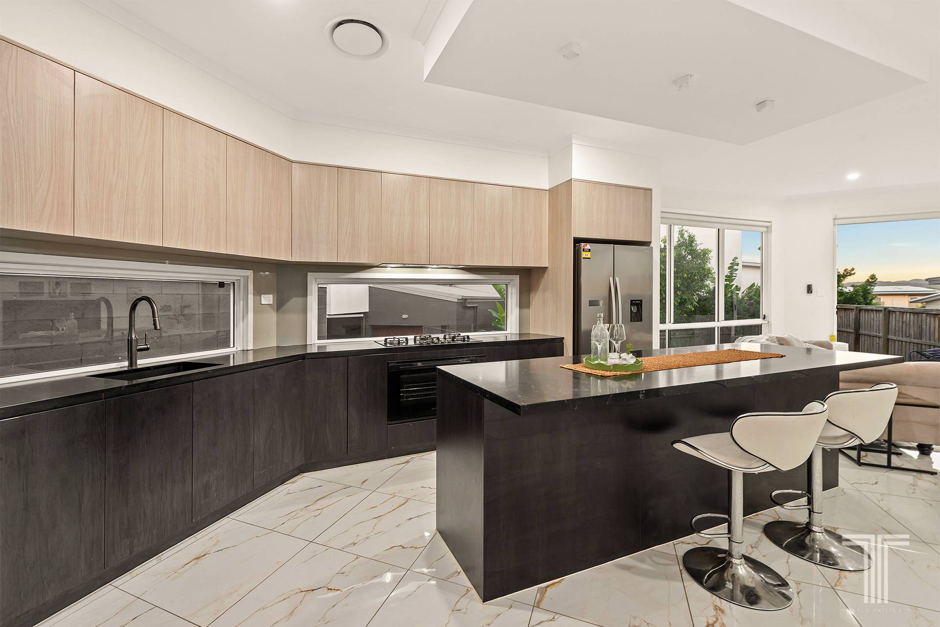 Marble flooring underfoot brings a sense of understated luxury across the ground level, while ducted air conditioning ensures comfort year-round. At the centre, the kitchen is both functional and impressive, appointed for entertaining with a generous butler's pantry and seamless connection to the living and dining zones. This is a space designed to bring people together, whether hosting a crowd or enjoying a quiet night in. The adjoining laundry is cleverly positioned to support the rhythm of everyday living without interrupting the flow.