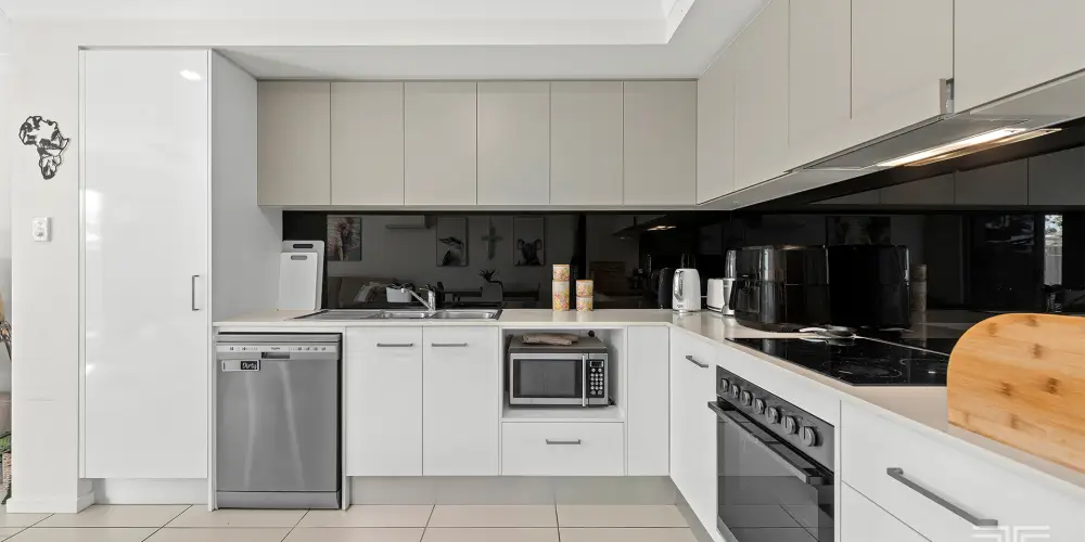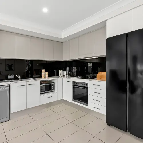 In the heart of the home, the kitchen stands out with its stone benchtops, glass splashback, and modern appliances. Throughout the house, you'll find a clean, contemporary aesthetic enhanced by neutral tones, energy-efficient LED lighting, and tinted windows for extra privacy.