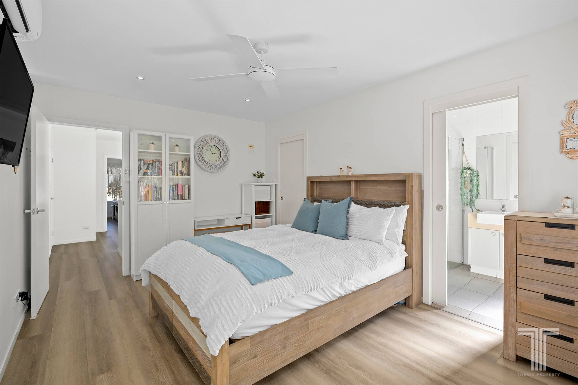 Accommodation has been carefully considered. Upstairs, the master suite offers a quiet escape with its own ensuite and walk-in robe, while two additional bedrooms with built-in storage are serviced by a well-designed main bathroom. Recent upgrades, including soundproofing hybrid flooring, add an extra layer of comfort and practicality. Air-conditioning and ceiling fans throughout ensure year-round liveability; while on ground level a separate laundry and secure parking complete the home's thoughtful layout.