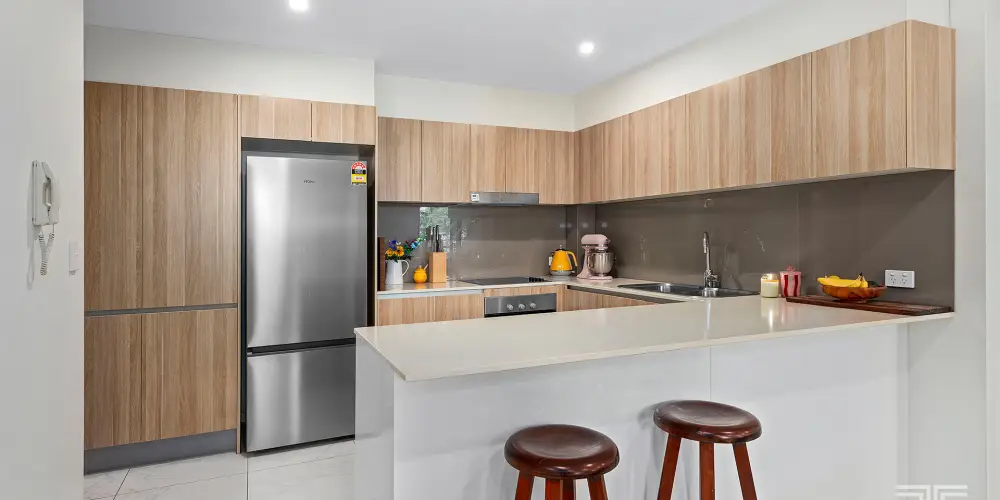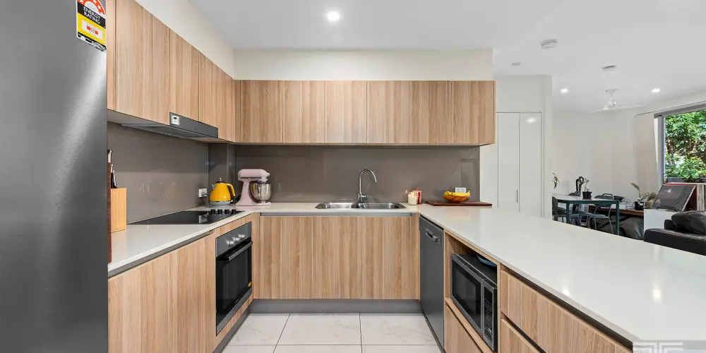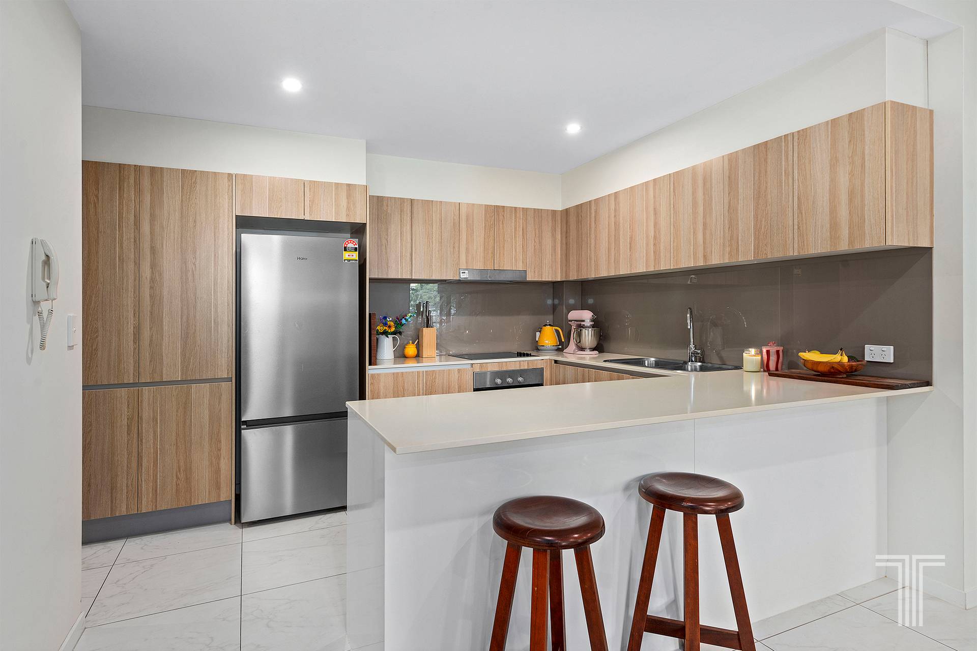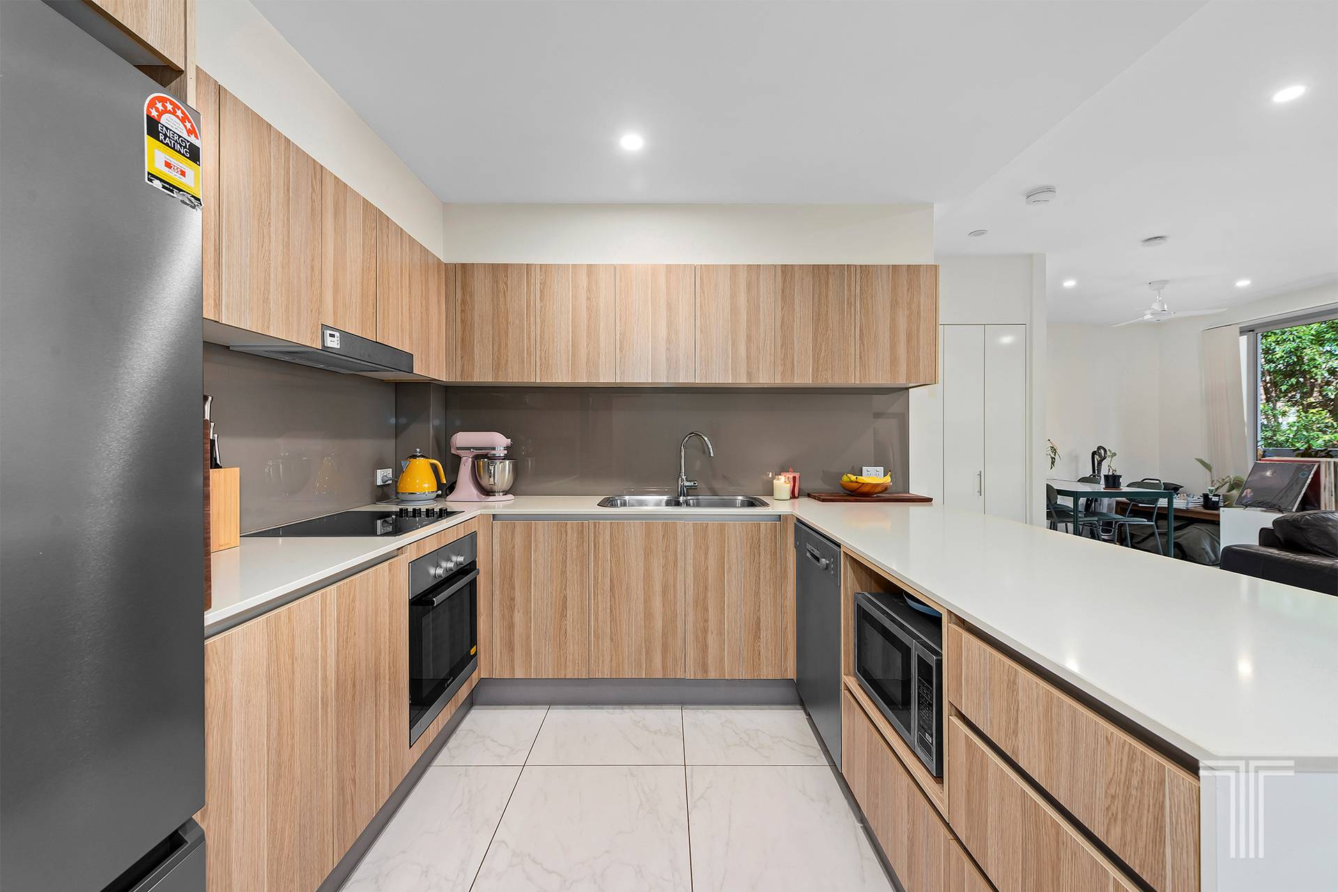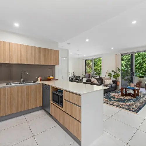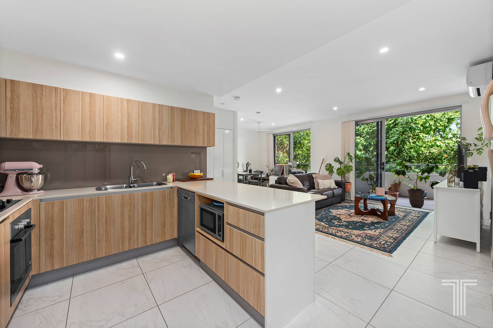 What stands out here isn't just the space, but the way it's been resolved, open where it matters, framed by a leafy, elevated outlook, and designed to feel quietly removed without losing connection to everything around it. The living and dining zone carries that feeling, stretching wide and light-filled, creating a setting that adapts just as easily to slow mornings as it does to evenings with friends. At its centre, the kitchen holds its own without overpowering, finished with stone surfaces, generous storage and a layout that keeps everything within reach, reinforcing a lifestyle that is deliberately low maintenance without ever feeling minimal.