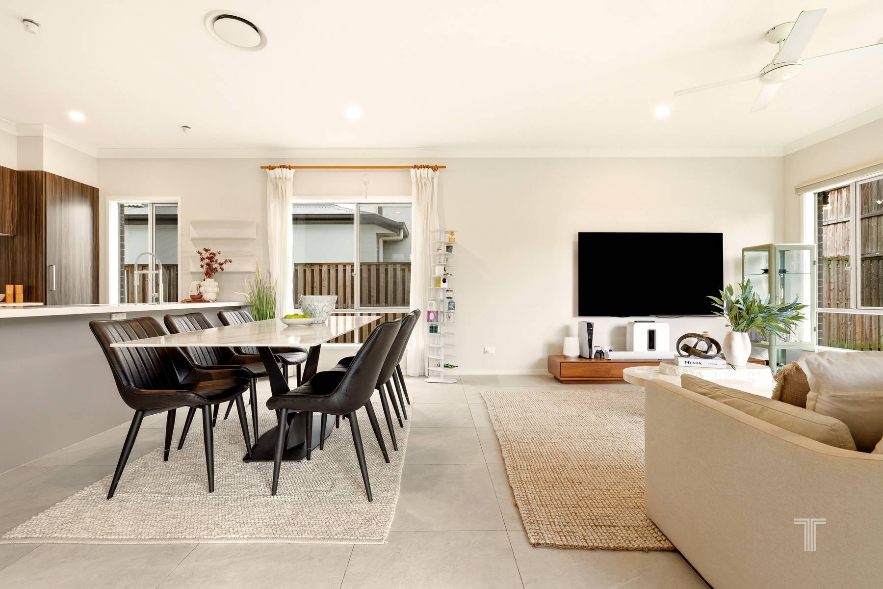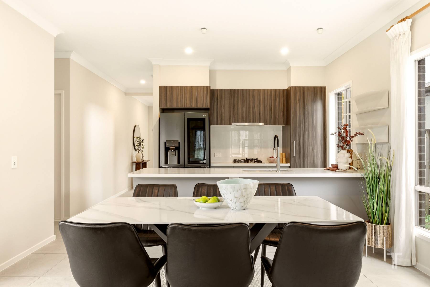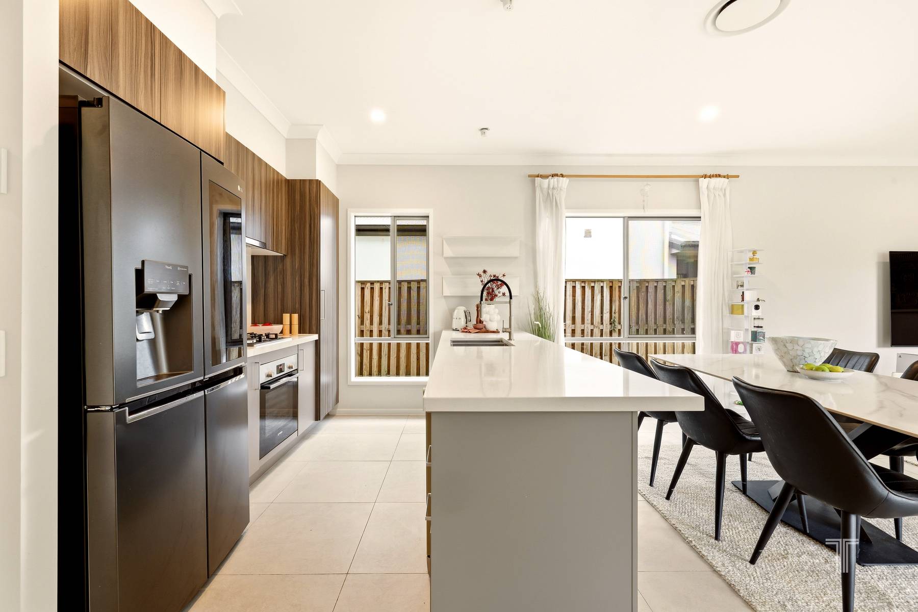 At the rear, the home opens into a spacious open plan kitchen, living and dining area designed to bring everyone together. The kitchen anchors the space with a sophisticated mix of tones and materials, blending modern finishes with subtle textural detail for a result that feels both elevated and highly functional.