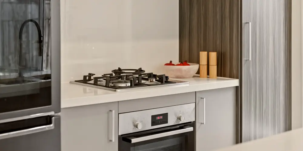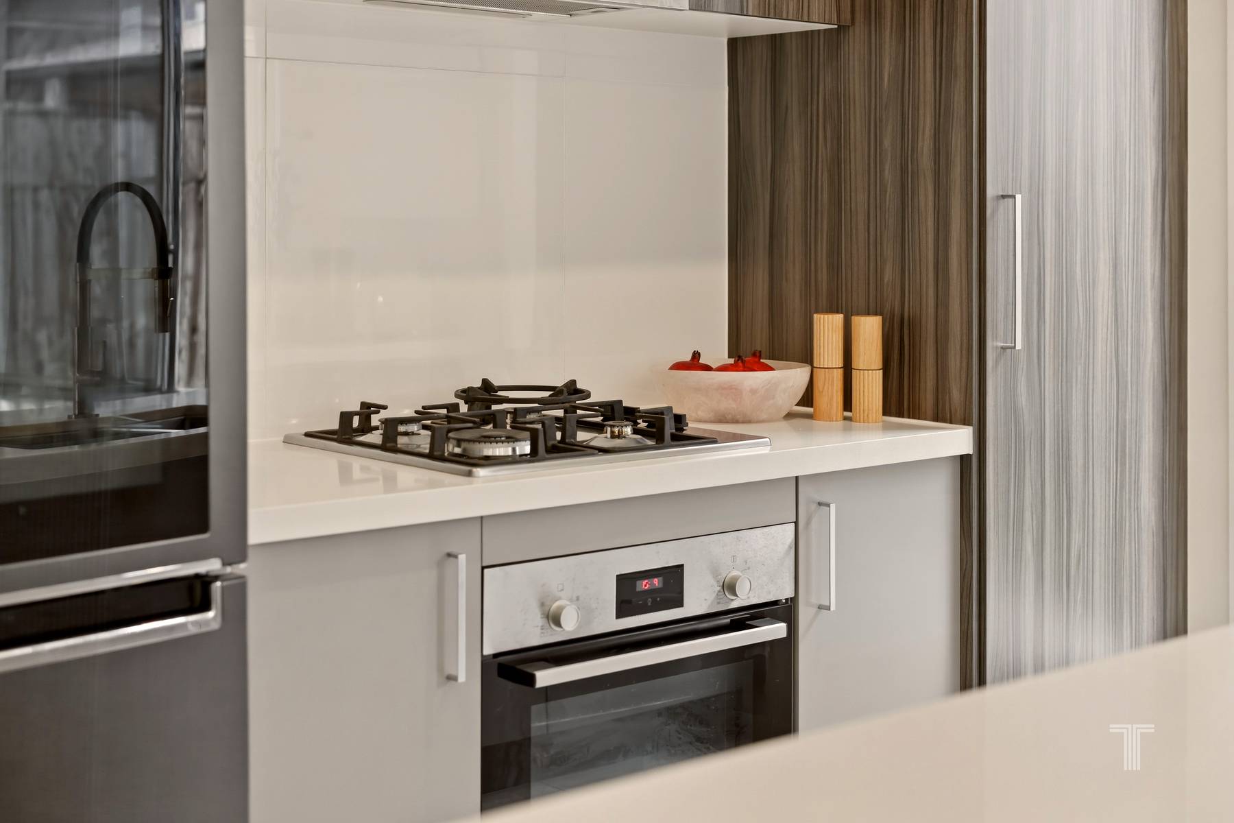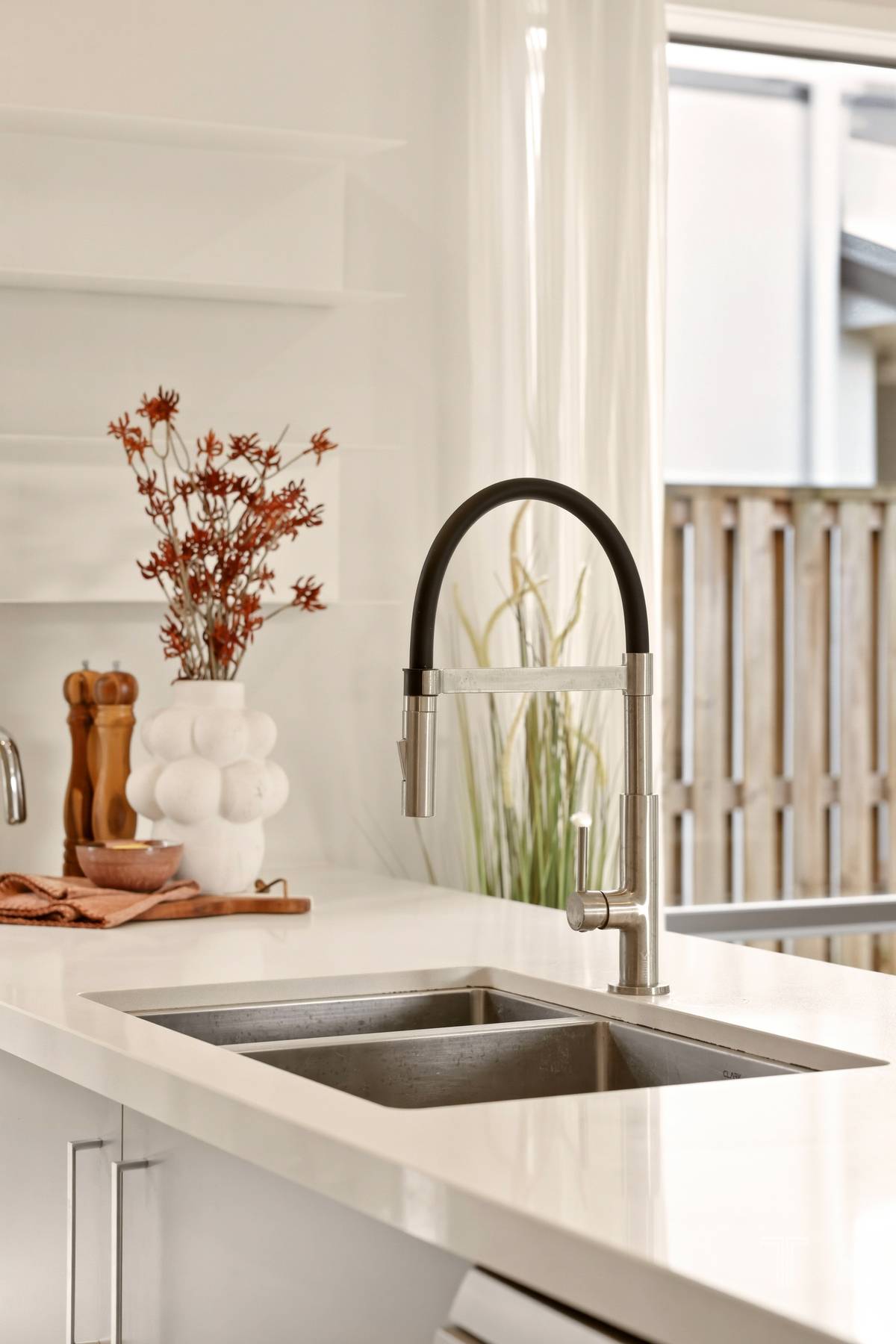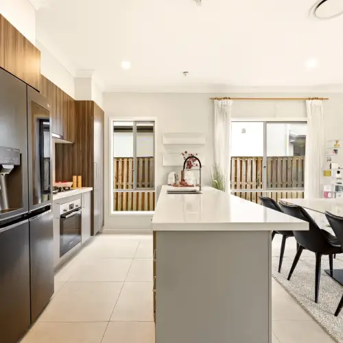 At the rear, the home opens into a spacious open plan kitchen, living and dining area designed to bring everyone together. The kitchen anchors the space with a sophisticated mix of tones and materials, blending modern finishes with subtle textural detail for a result that feels both elevated and highly functional.