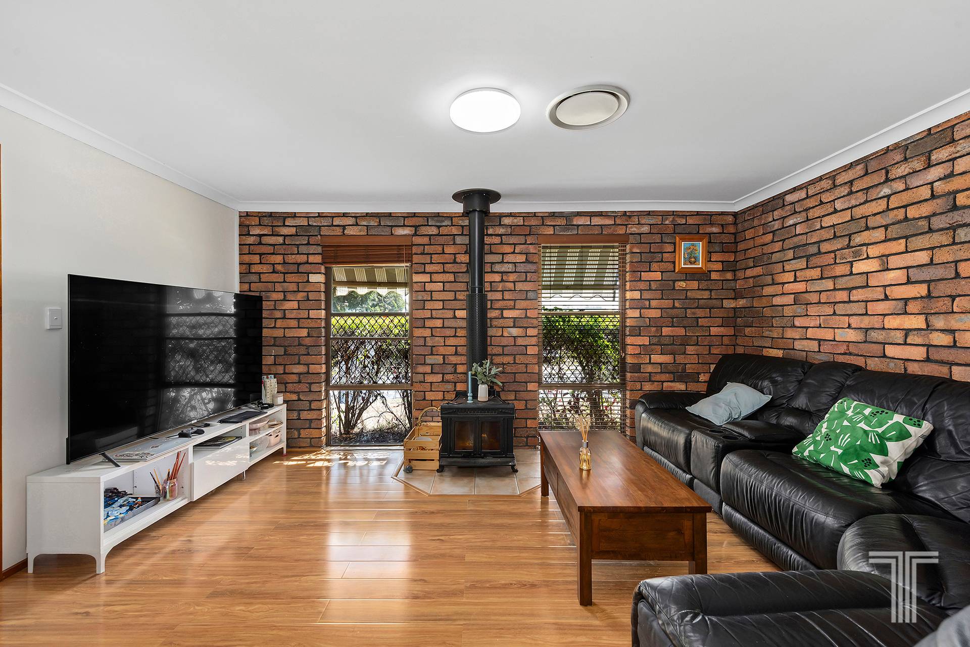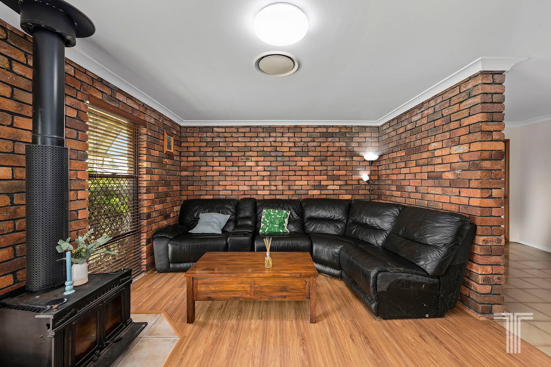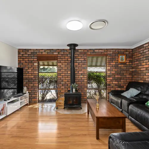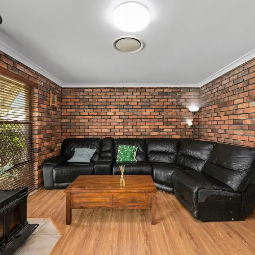 Step inside and the home opens with an immediate sense of personality and comfort, where enduring materials create a space that feels grounded and welcoming. At the front of the home, a more formal main living room makes an immediate impression, anchored by a striking exposed brick feature and combustion fireplace that bring texture, warmth and timeless character to the space. It is a standout focal point, perfectly positioned to create a cosy retreat away from the home's more casual living zones.