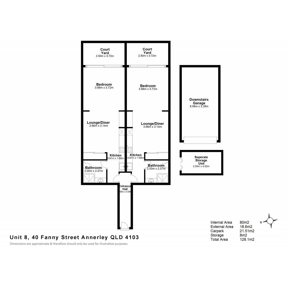 This clever floor plan showcases 2 completely seperate units with their own bedrooms, bathrooms, living areas, entrances and courtyards. Each unit includes large built-in wardrobes for the bedrooms, internal washing machines/laundry and split system air conditioning. Clearly designed to maximise investment potential and generate the highest rental return possible, this boutique development (still under Builders Warranty) has successfully achieved this with a great record in both AirBnB and residential lets.