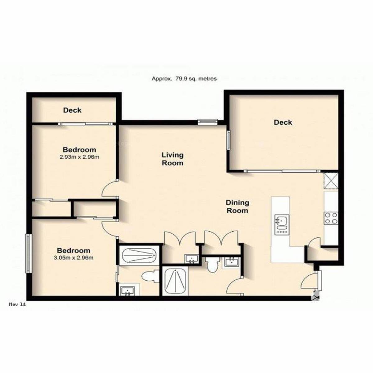 The master bedroom features a private ensuite and built-in robe. The second bedroom is also well furnished, including a large built-in robe and a private balcony.