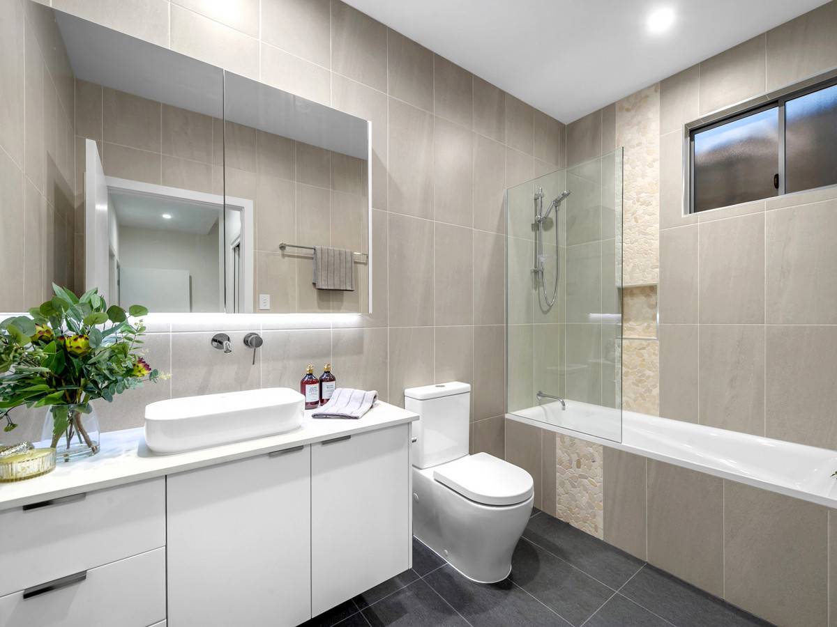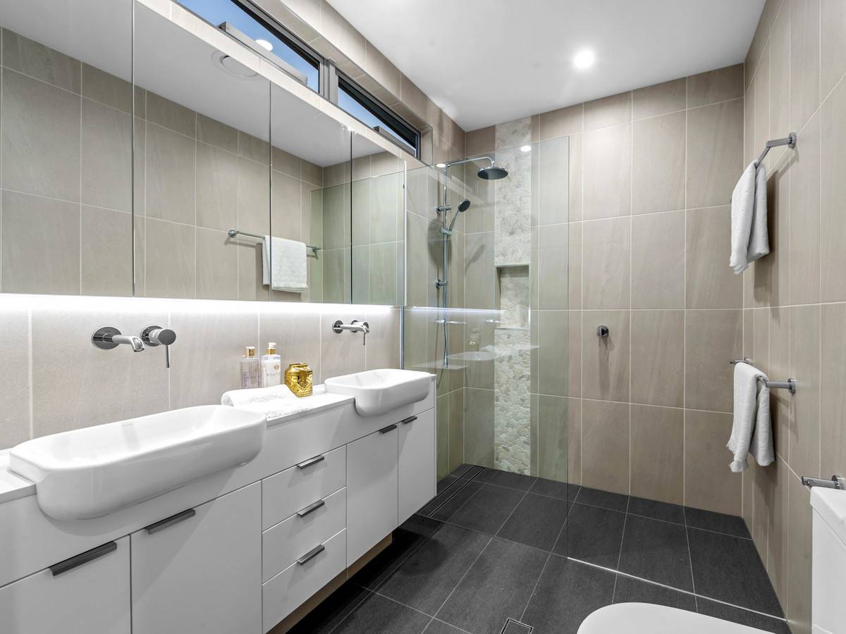 The master bedroom has floor to ceiling robes to complement the walk through robe to ensure plenty of storage options. The en-suite bathroom comes with double basins and mirrored cabinets.