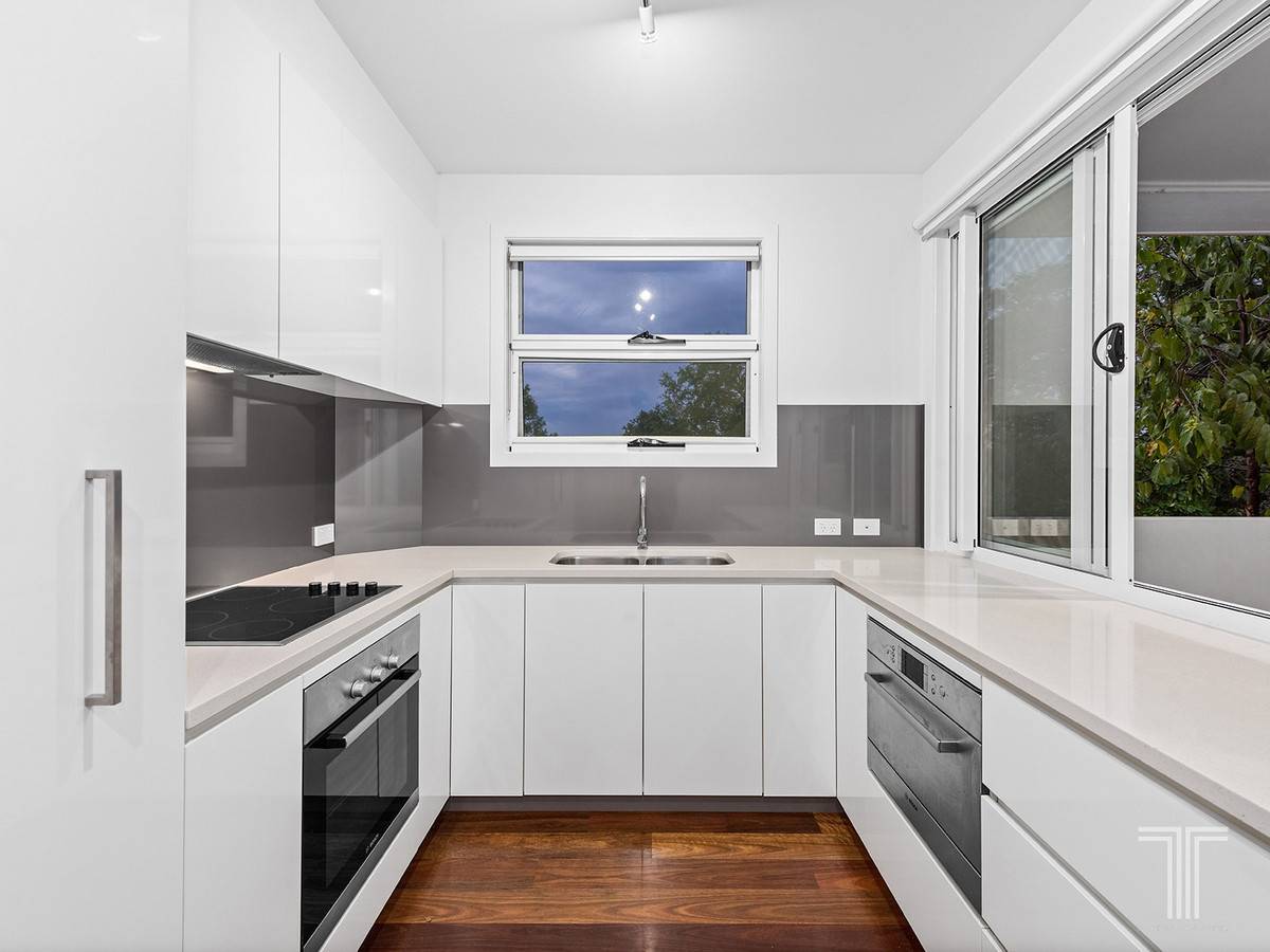 Sleek stone benches with high quality built-in cabinetry, integrated appliances including dishwasher and modern splashback which complement the fresh look design.