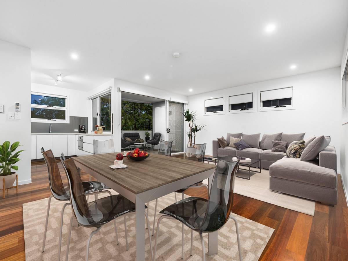 Middle-level combined lounge and dining area with powder room. This space is air-conditioned, boasts timber floors and multiple windows for natural light and airflow.