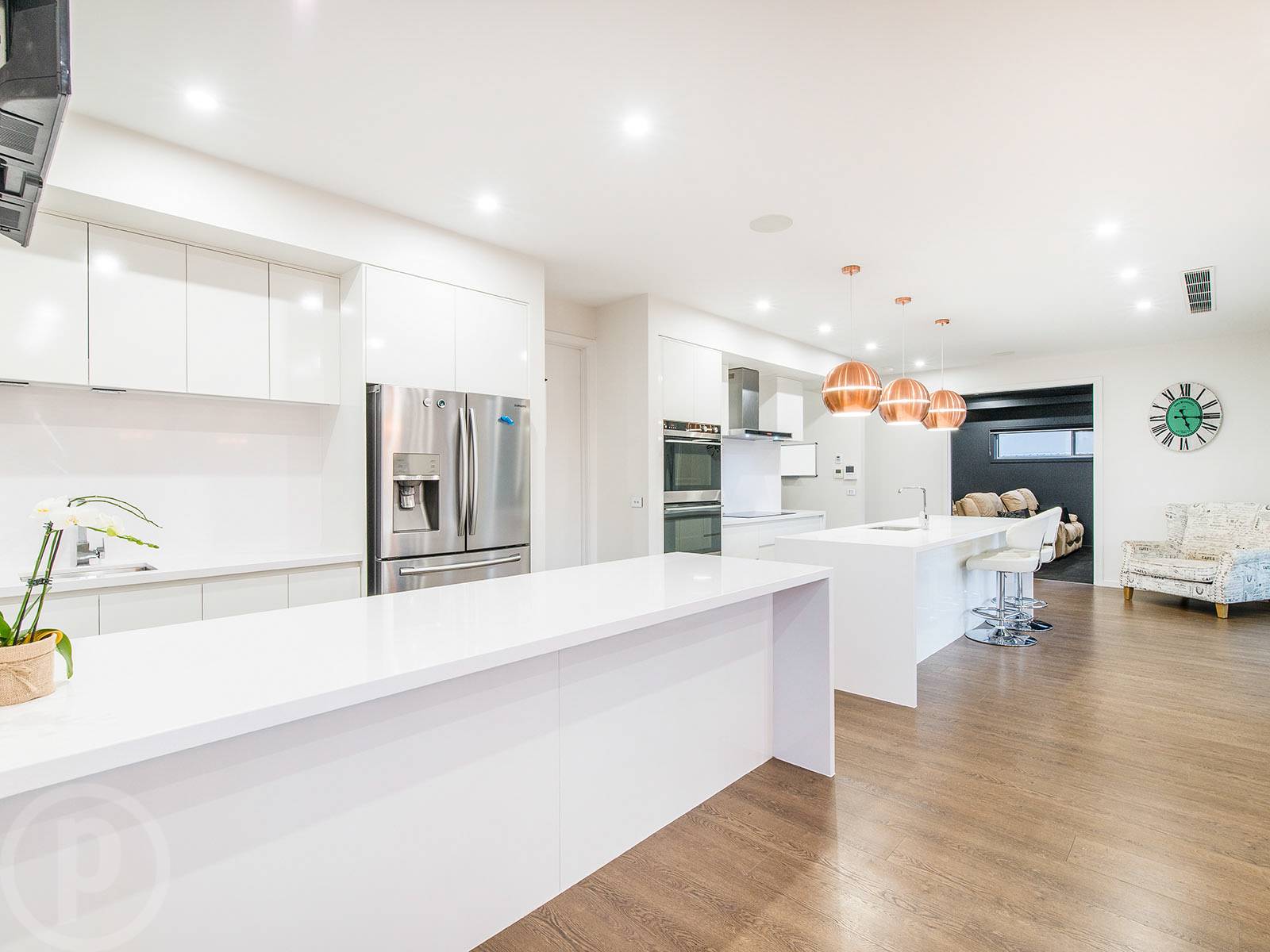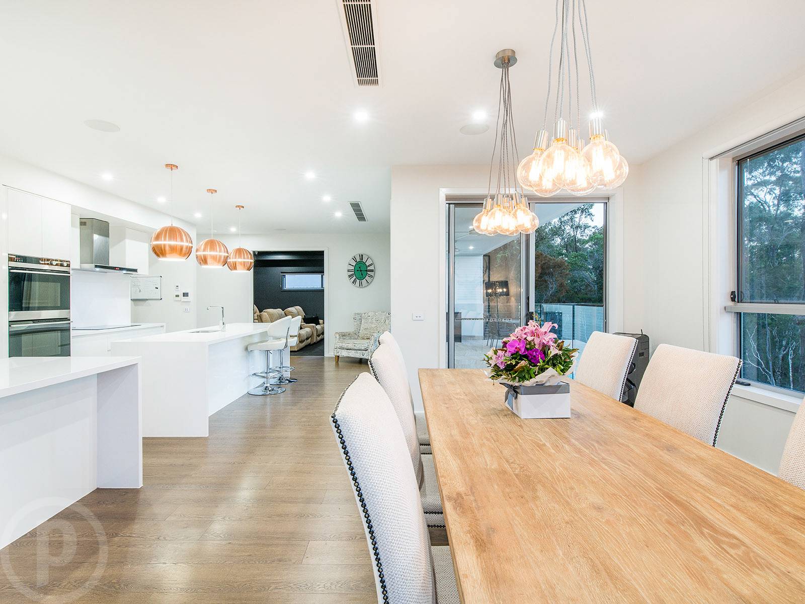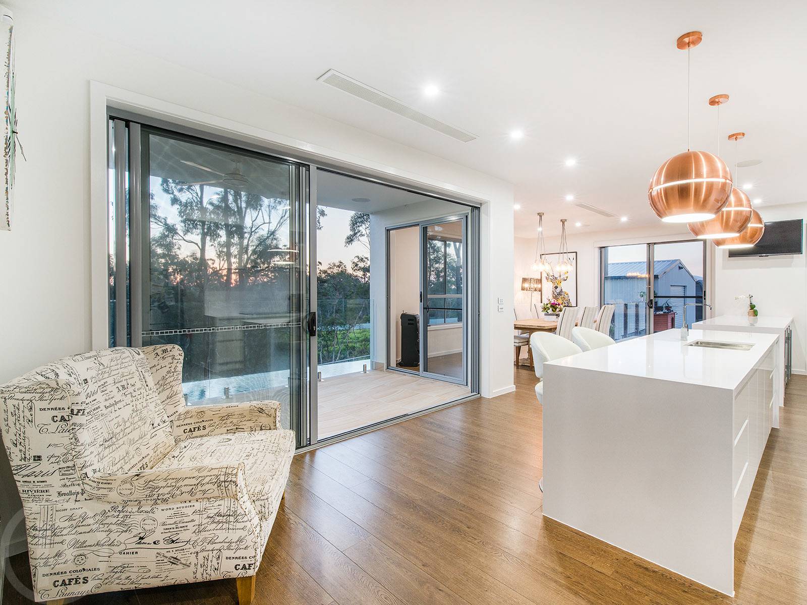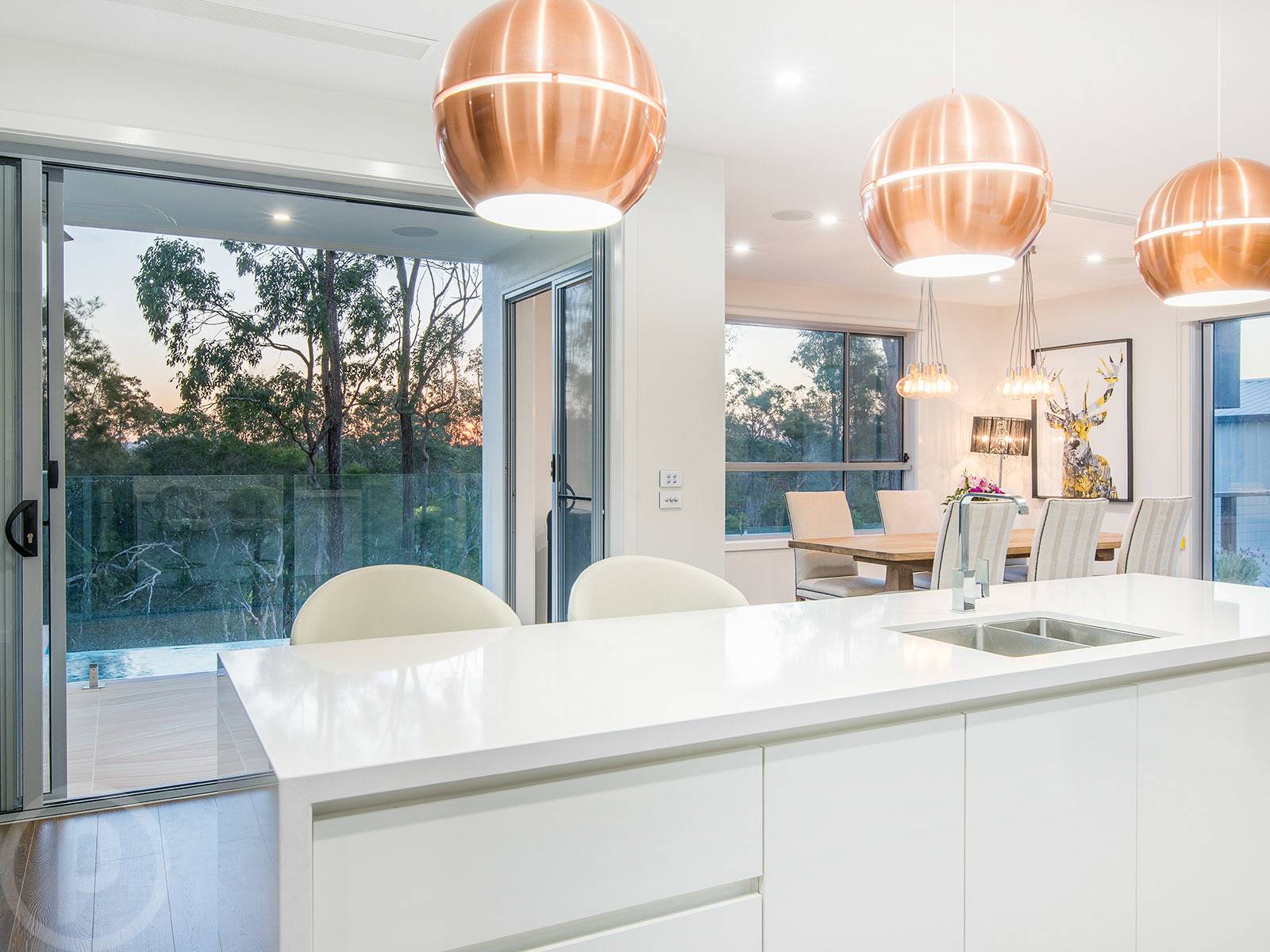 This modern open plan design serves the kitchen, lounge and meals area well. With banks of windows framing the greenery outside. As expected in a home of this calibre, the kitchen has been well designed and immaculately appointed. Two stone topped island benches create a huge culinary space complete with soft close drawers, two built in under bench bar fridges, wall mounted oven, feature copper pendant lights and an oversized butlers pantry that will encourage easy entertaining and a fuss free everyday life.