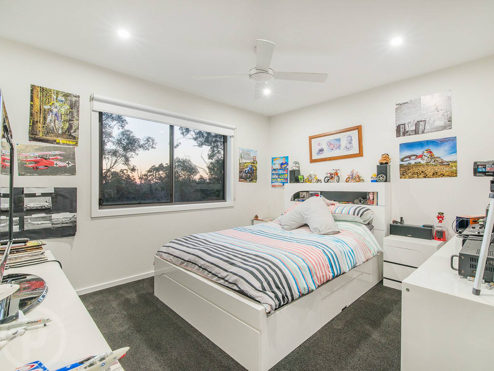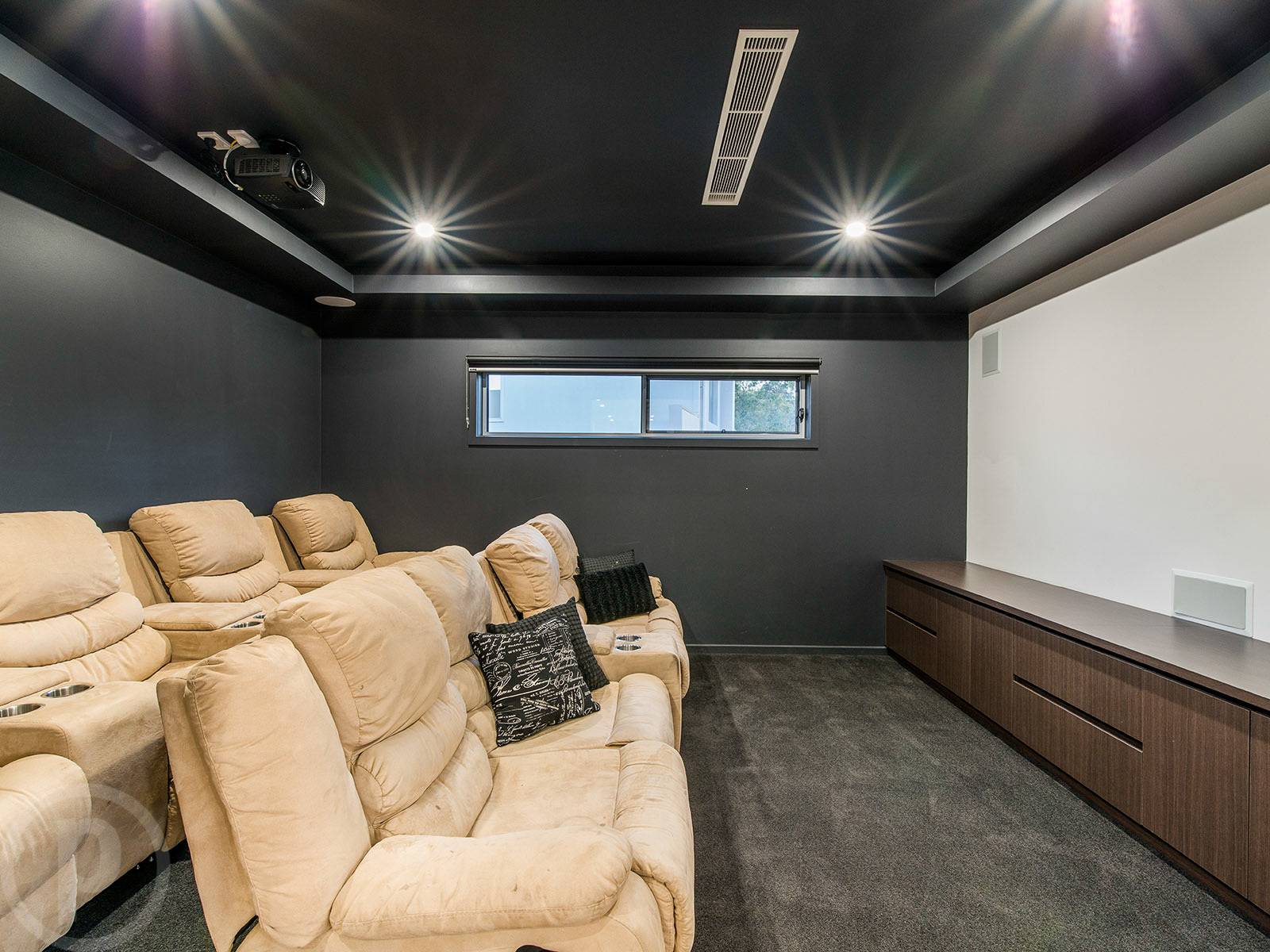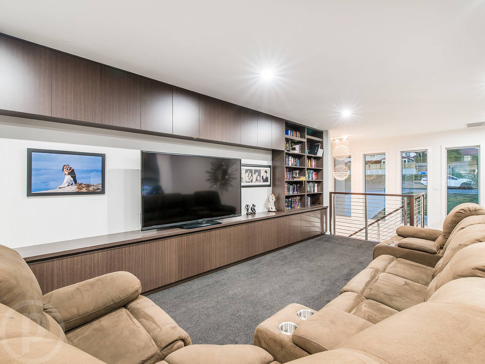 Living space on the lower level is provided by a separate, designated media room. Fitted with a projector and sound proofing, this area can be completely closed off from the main space, perfect for movie night. Upstairs hosts a large family lounge retreat with extensive storage and a built-in office space.