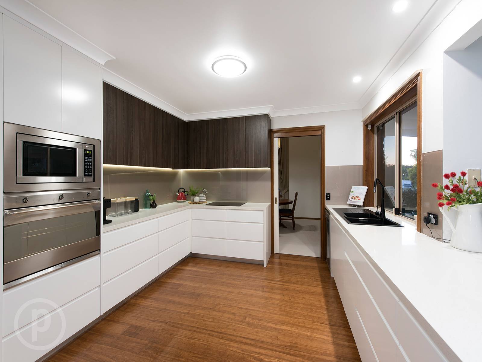 A stunning kitchen adjoins this space featuring stone waterfall benches, induction cooktop, stainless steel Smeg appliances, double black granite sink, 700mm wall mount oven, provision for a plumbed fridge, soft close drawers and walk-in pantry.