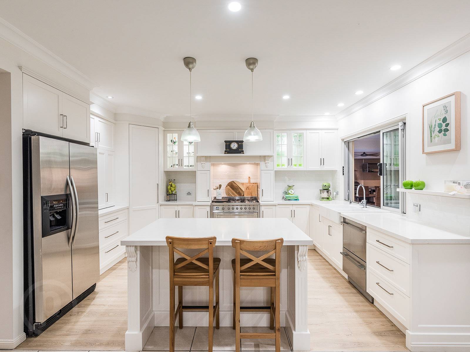 High ceilings, plantation shutters and porcelain tiles welcome you to the open plan living, dining and kitchen area. Create memorable meals in the Hamptons style kitchen, complete with stone benchtops, soft close drawers, servery window, six burner freestanding gas stove/oven, double drawer dishwasher, premium stainless steel appliances and ample bench space and cupboard storage.