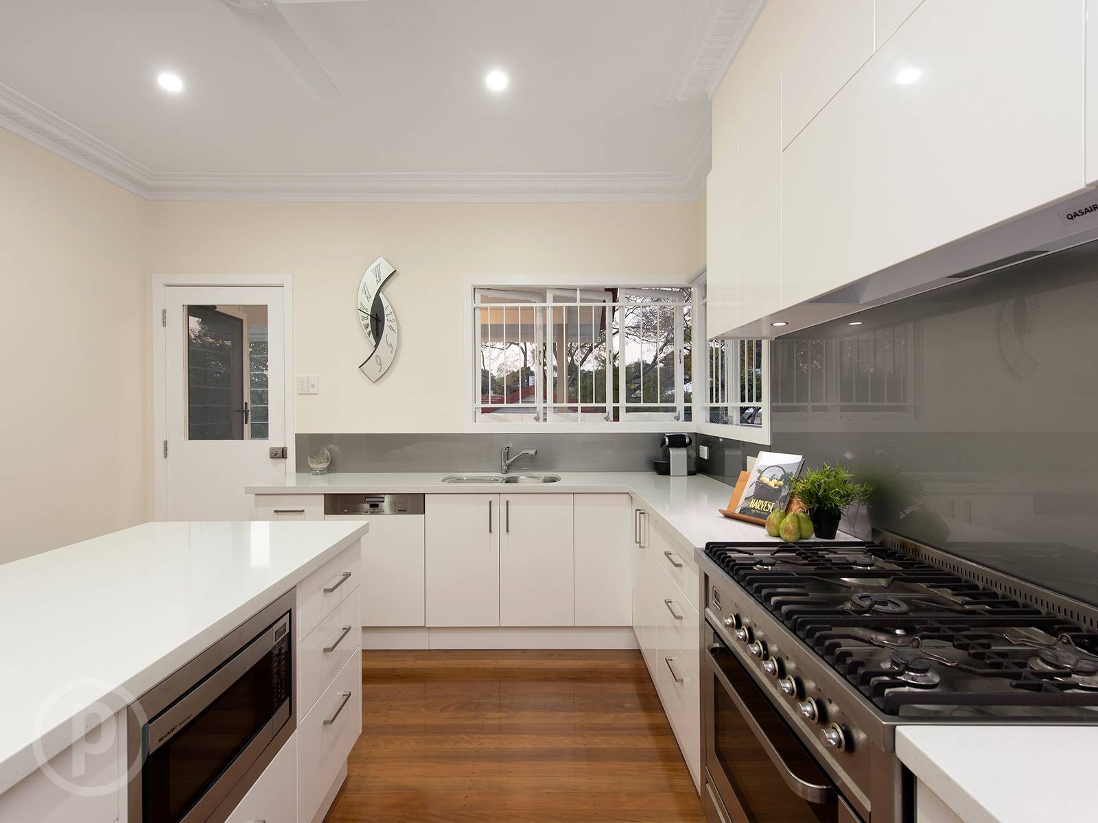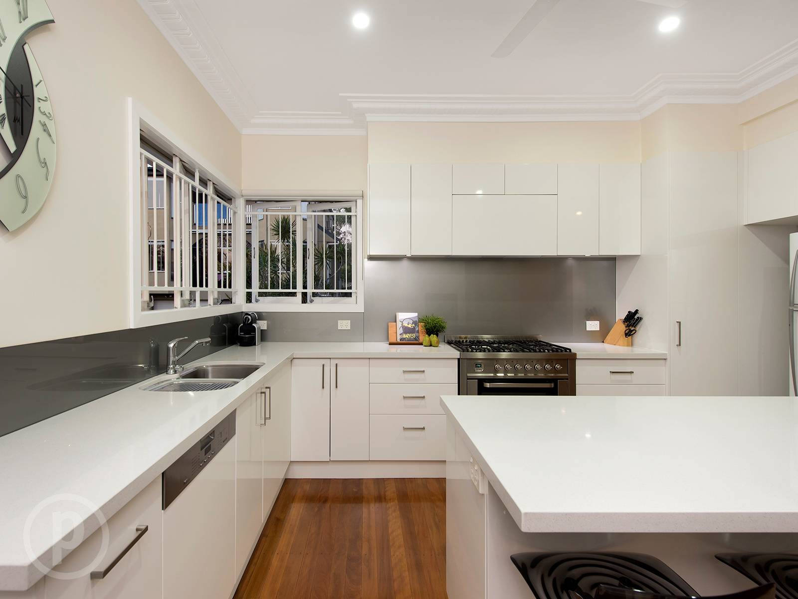 A modern kitchen adjoins this space with its white cabinetry and stone benchtops contrasting perfectly with the timber flooring. This space includes Miele appliances, five burner gas stove, dual sink and ample storage.