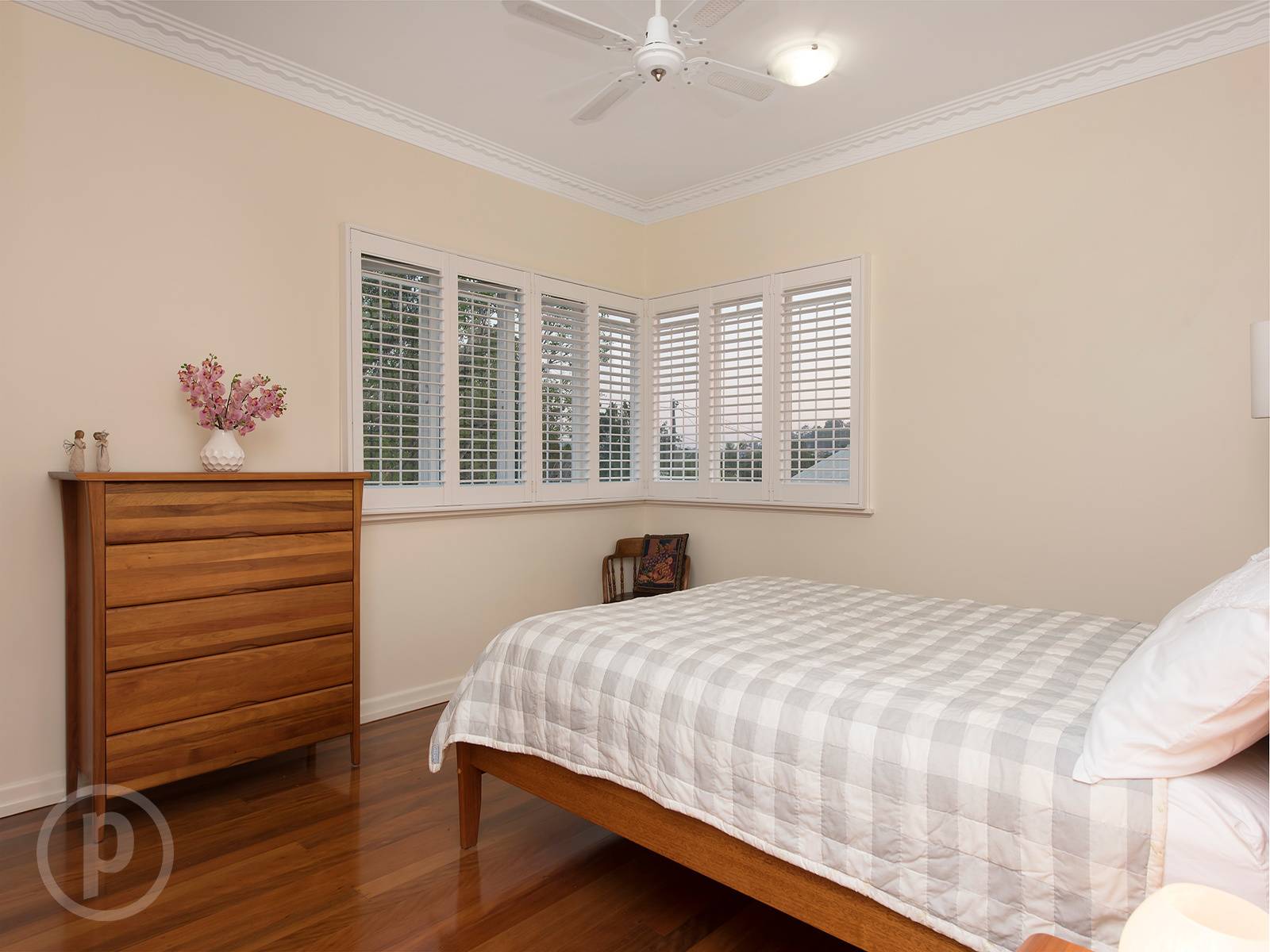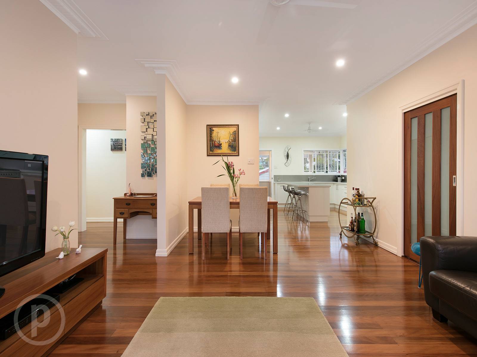 Complemented with dark timber flooring and fresh neutral tones, the open plan living and dining area is ready for your own splash of personalisation and includes plantation shutters and ceiling fans.